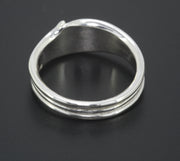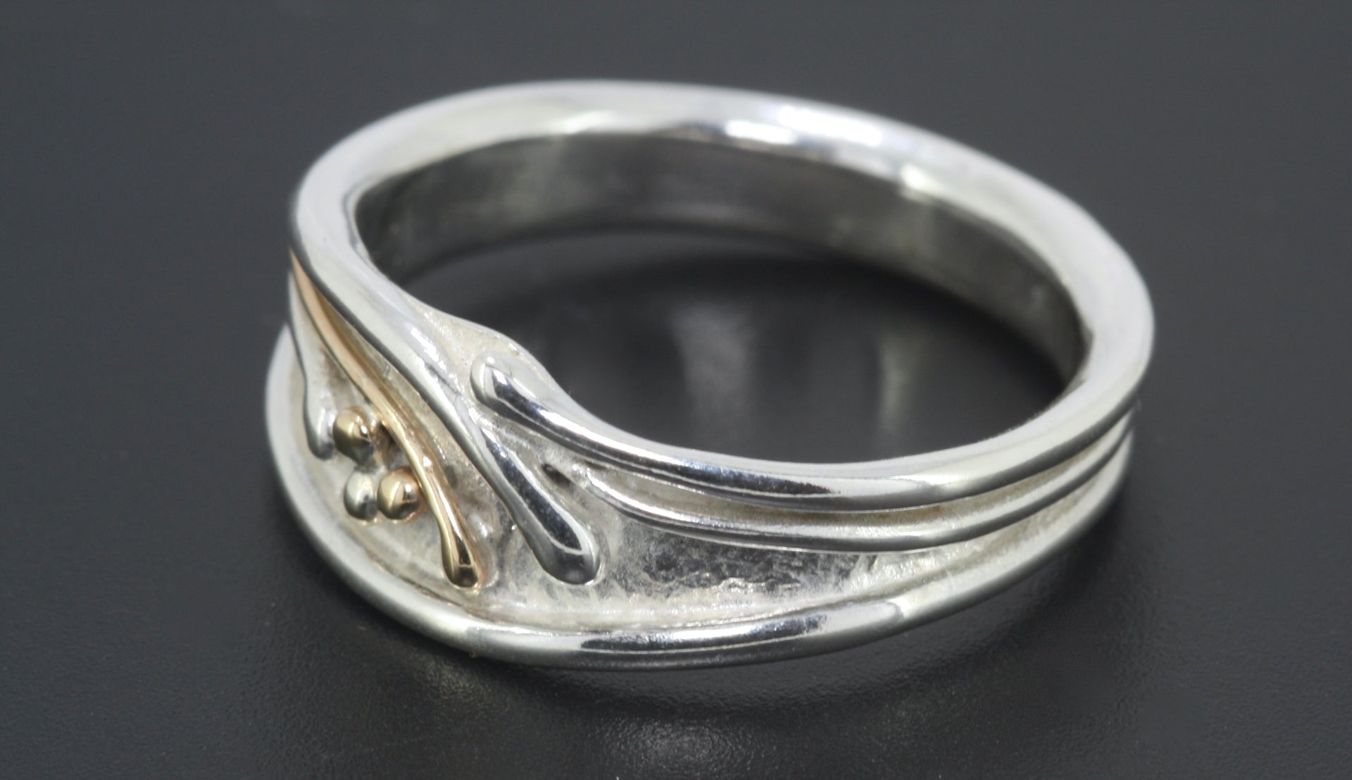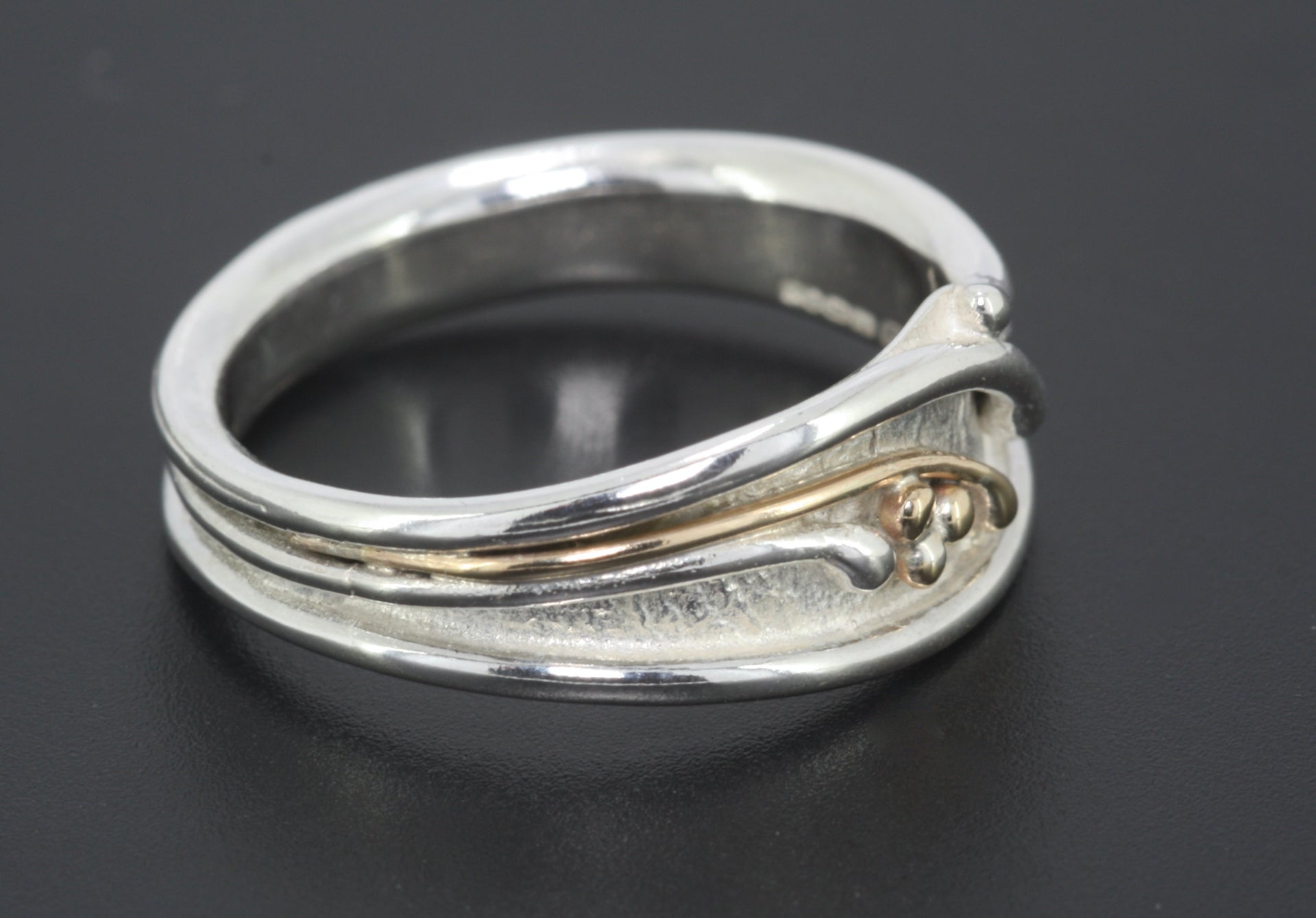 A beautiful organic ring created from sterling silver with 9ct gold beaded / wire detail. The band has a reticulated finish to it and has an undulating feature. Lovely and comfortable to wear. would make a fabulous alternative wedding band.