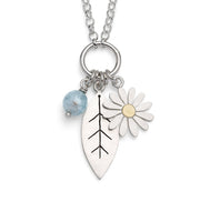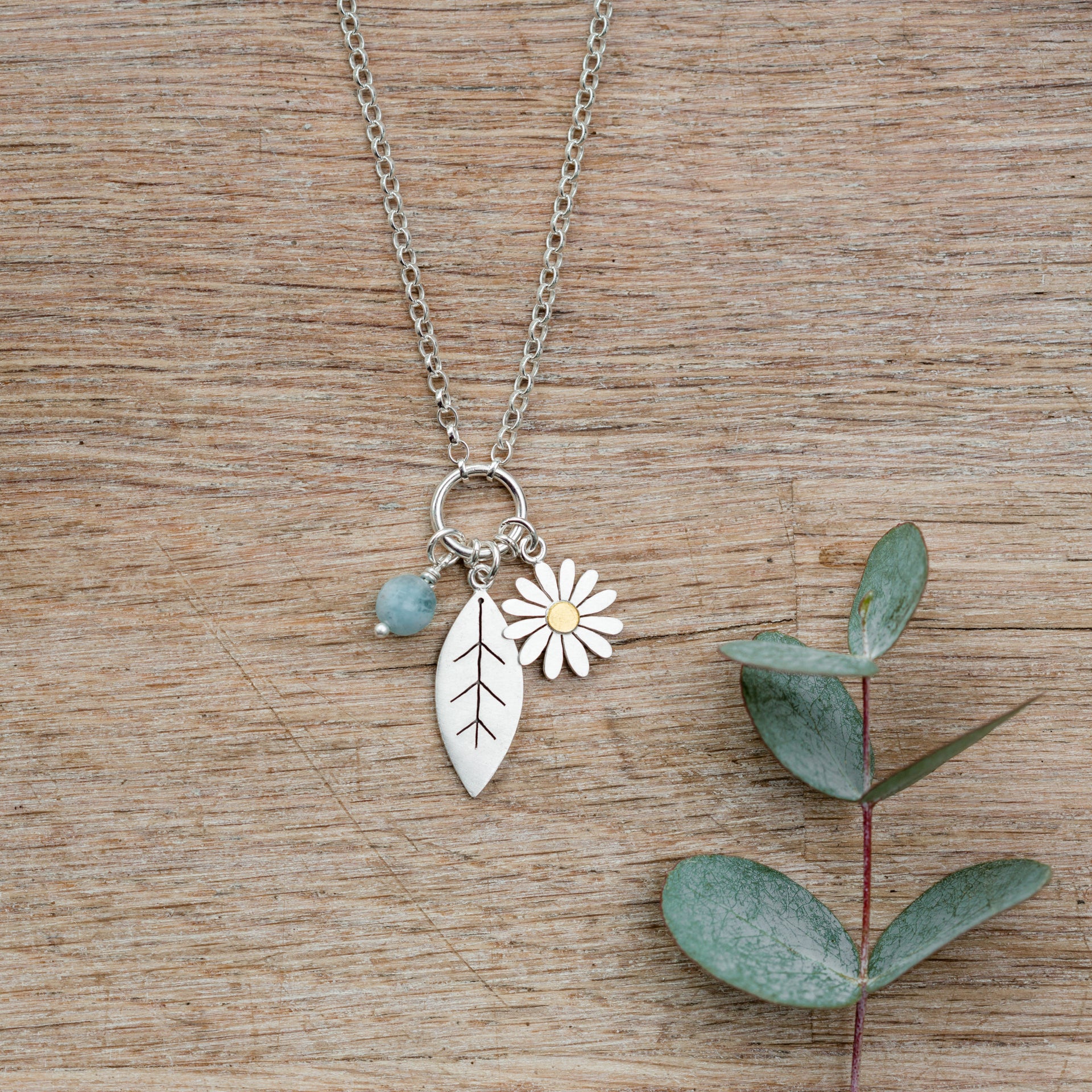 A charming collection of a solid silver and 18ct gold aster flower, a pierced silver leaf and a beautiful blue aquamarine. All hanging independently from a circle of silver on a 22″ silver chain. The aster flower has a hand forged 18ct gold centre and both the leaf and the flower have been given a satin finish which beautifully highlights the 18ct gold. The blue aquamarine bead reflects the colours of the vibrant asters that grow well into Autumn.