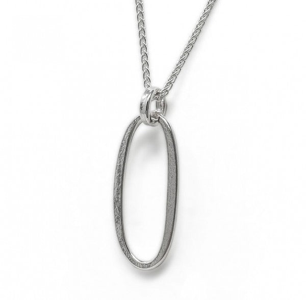 The SUPER NOVA Pendant necklace is a finely-crafted, sterling silver motif, hanging on a fine-linked silver chain. Latham and Neve's design is all about detail, and this piece is no exception, with its clear references to contemporary Finnish design; the slightly chunkier, lozenge-shaped loop motif of British Hallmarked silver is hand-beaten for a shiny finish, while the inside is softly textured. It's a subtle expression of the silversmith's art, and it is linked to its chain with a ring of solid silver.