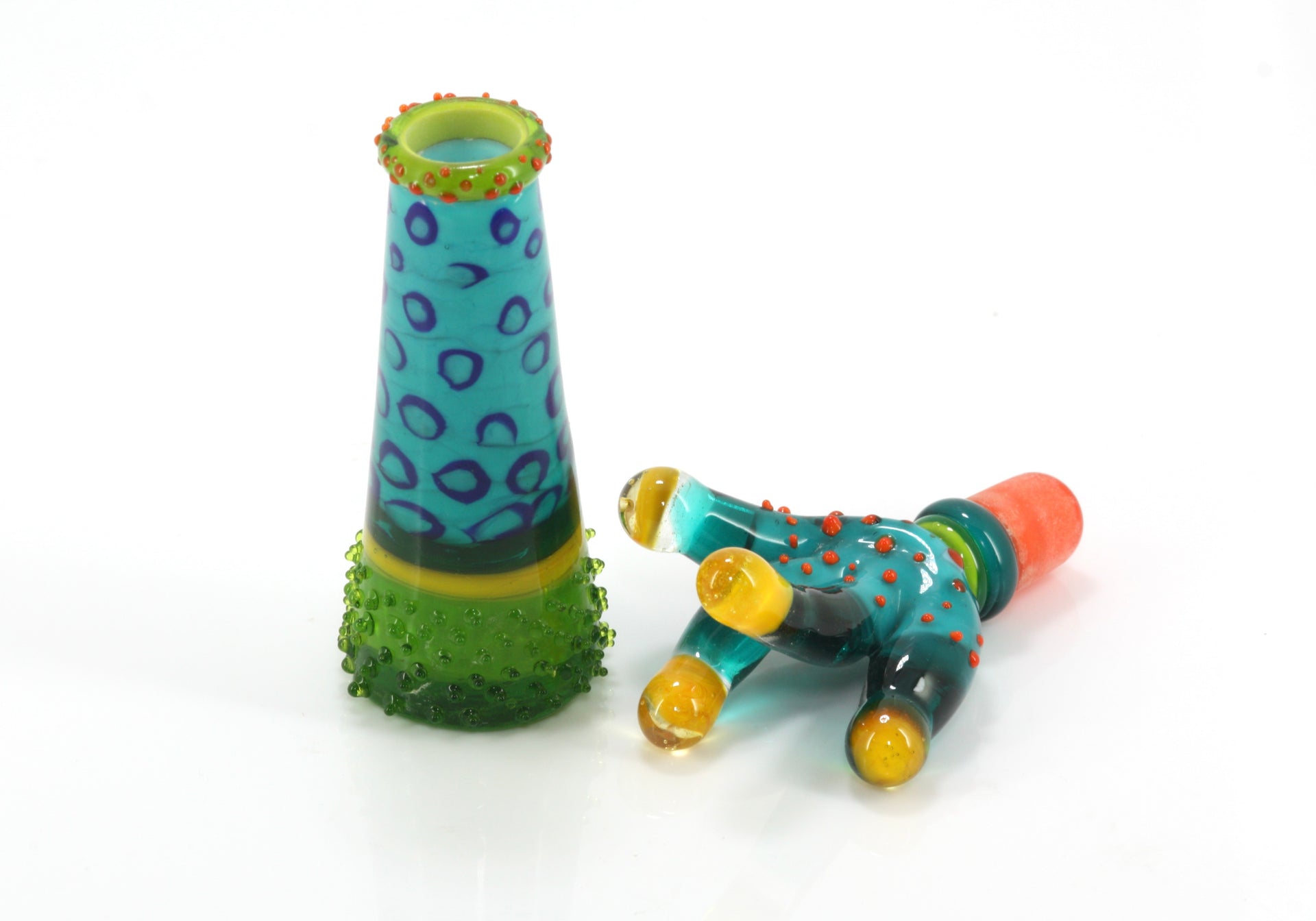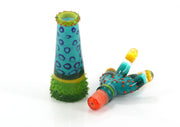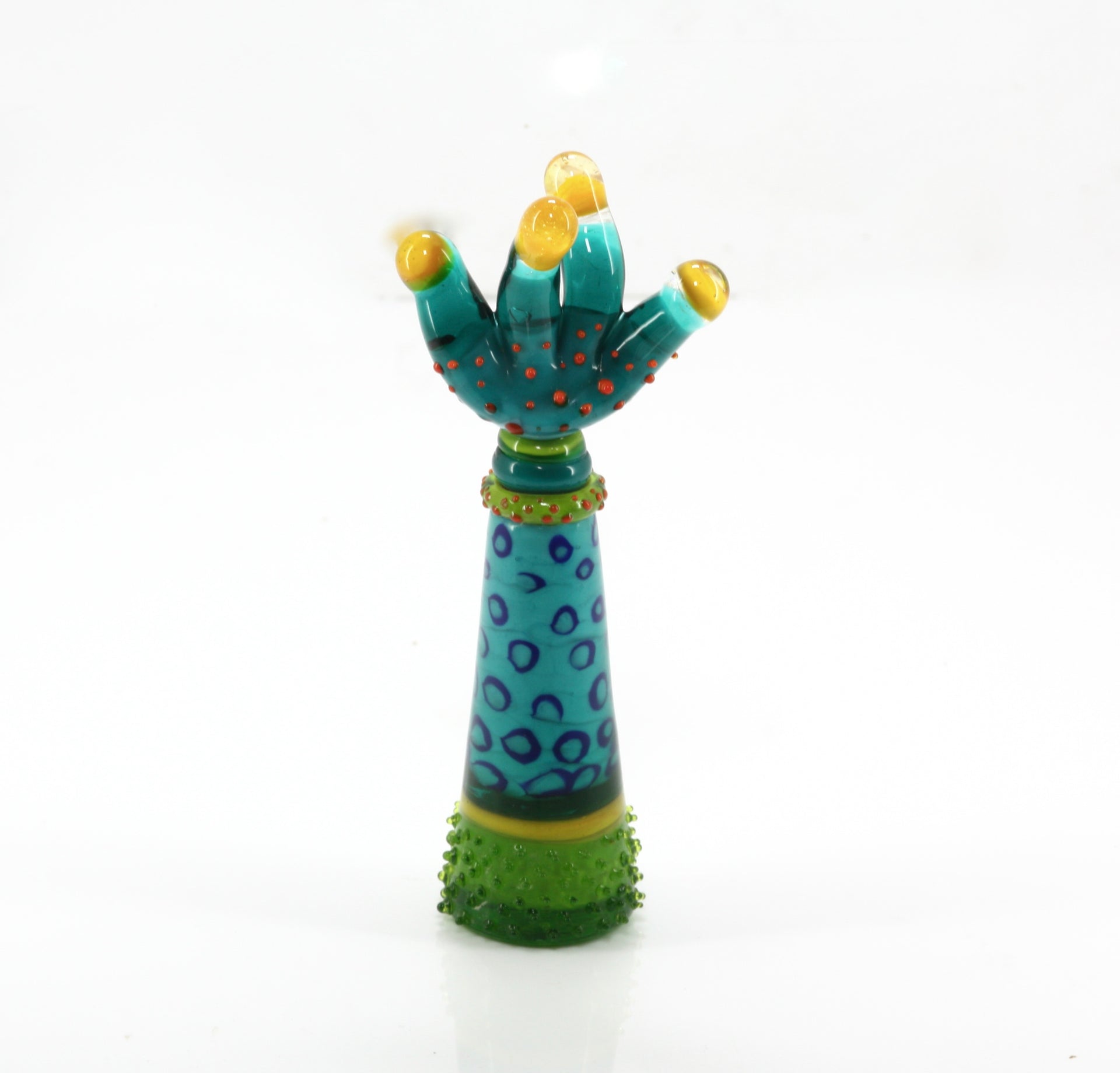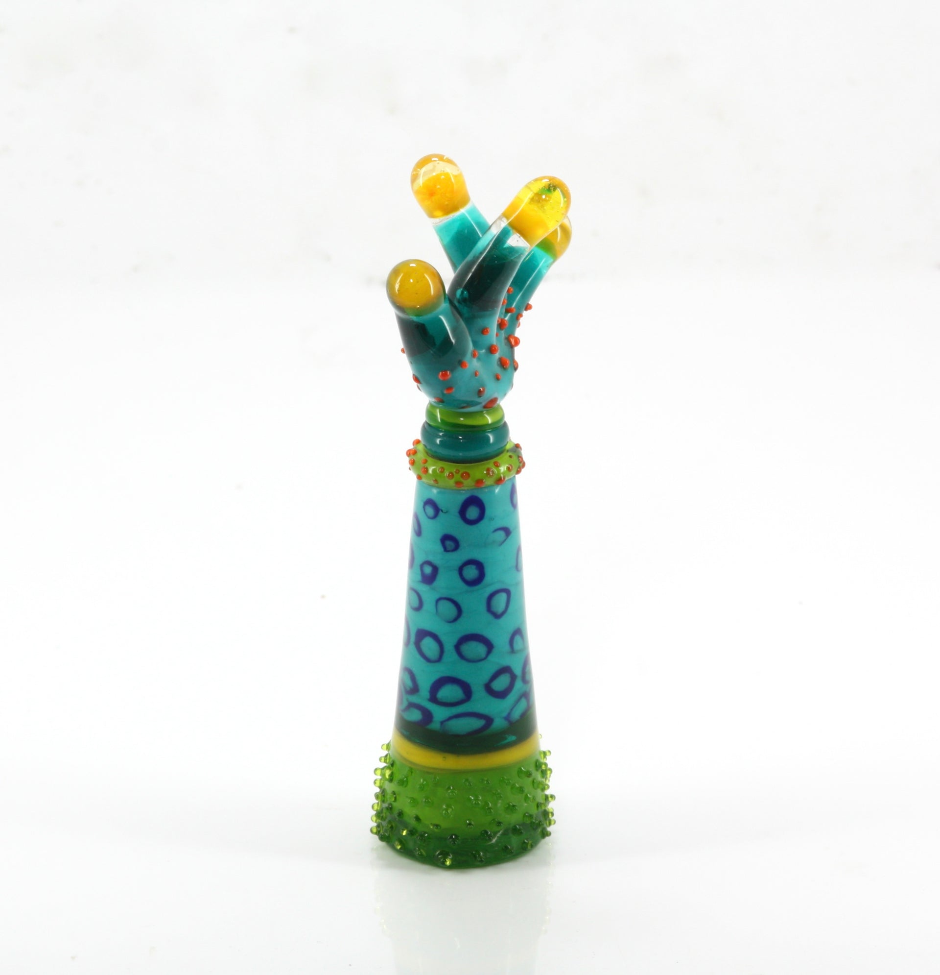 A unique Totem Vessel in flameworked glass in vibrant blues with yellow, orange and green details. This piece is handmade with each bead of glass carefully applied to the surface.