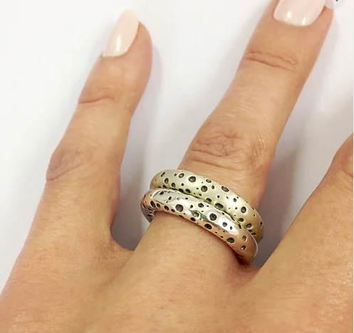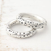 This chunky halo silver ring is a classic design. A sterling silver band features a profusion of tiny holes that have been oxidised (blackened) to create contrast. The patterning gradually peters out towards the back of the band.