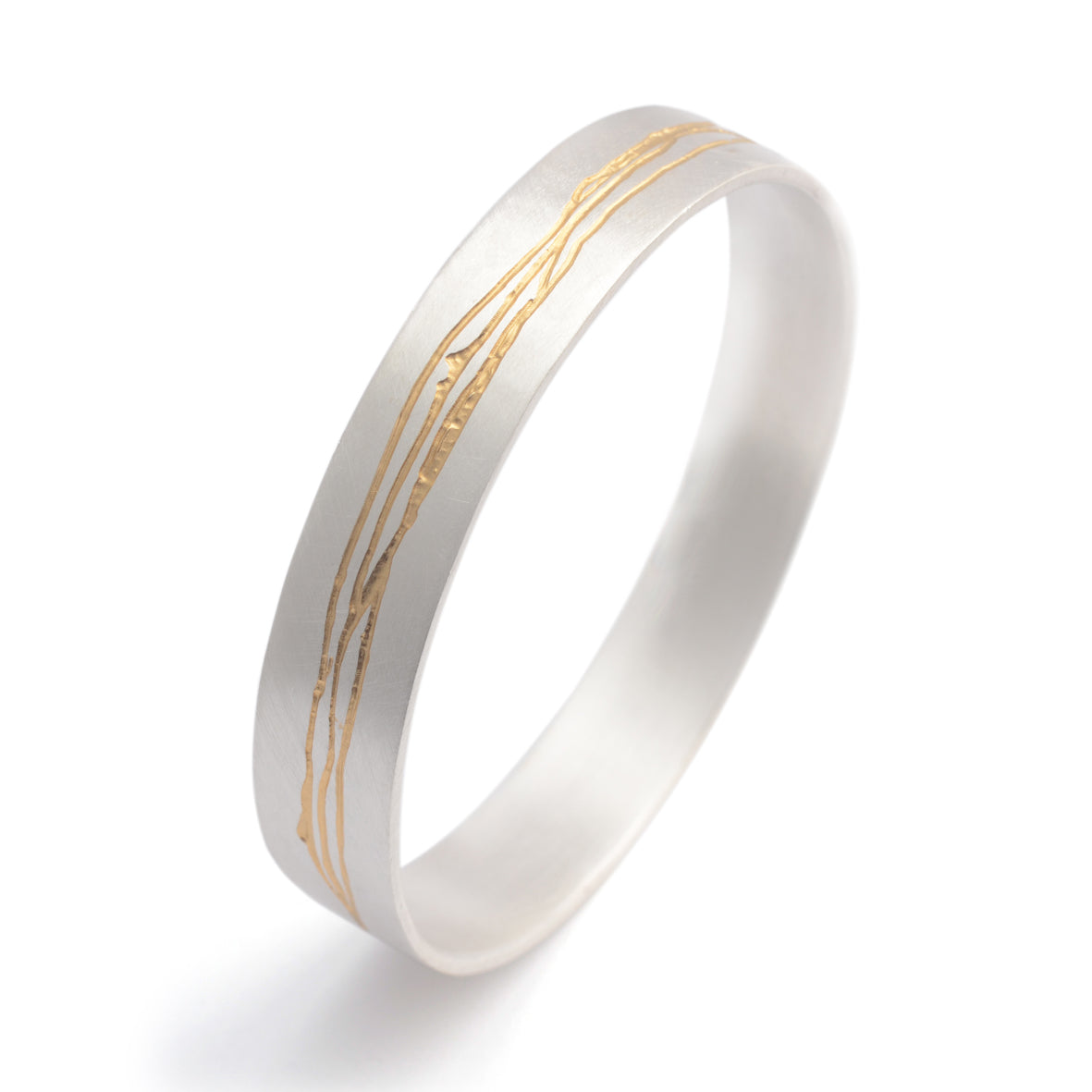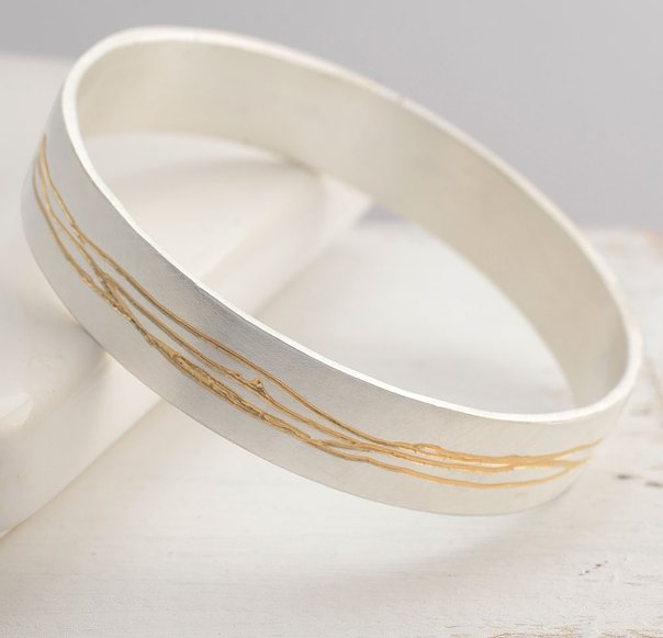 A beautiful hand-etched silver & gold bangle with an acid-etched pattern where a rich layer of gold plating is applied to the etching, creating a wonderful contrast with the sterling silver.