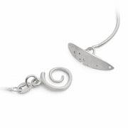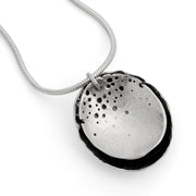 Pretty silver necklace featuring a delicate, hand drilled front layer behind which sits an oxidised silver layer to create visual contrast. with a curved patterned T-bar style catch.