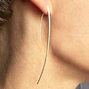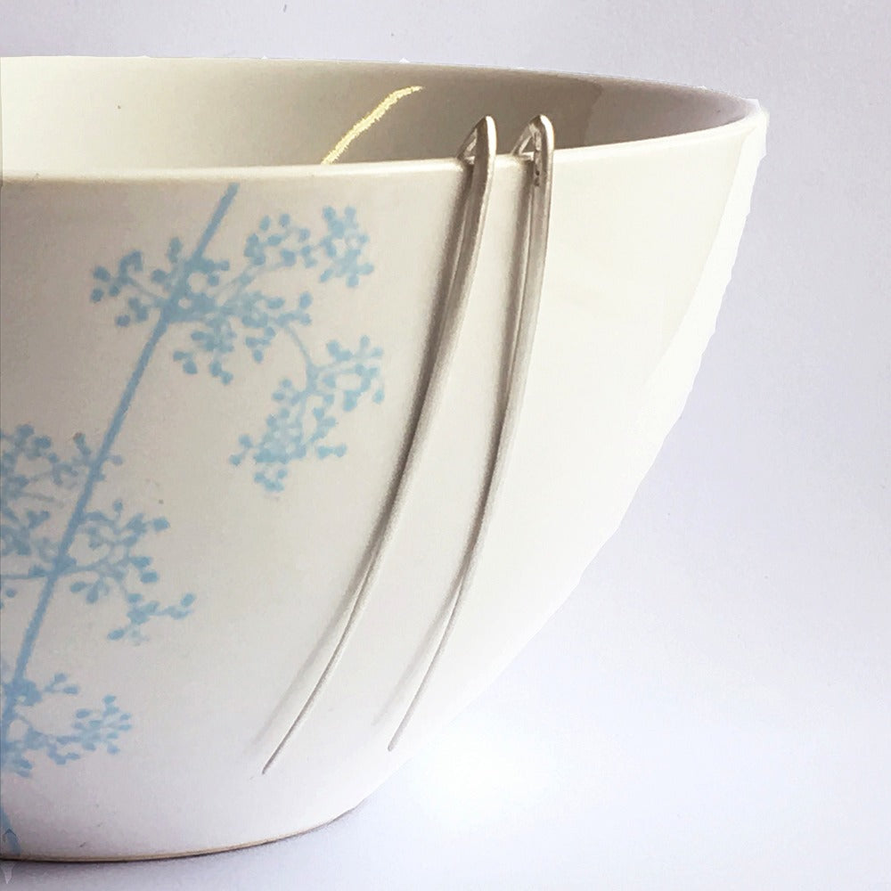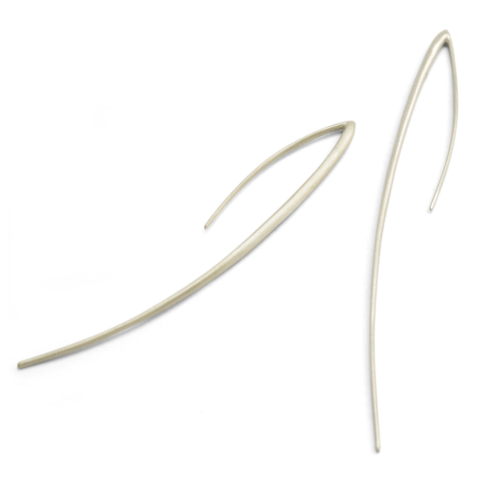Strikingly elegant curved spike silver strand earrings feature fluid lines inspired by bare winter branches. The earrings are held in place by a discreet stopper that threads onto the shorter strand and sits behind the ear. Handmade in Kate Smiths Jewellery Quarter workshop, Birmingham, England. Created in hallmarked sterling silver with a soft satin finish.