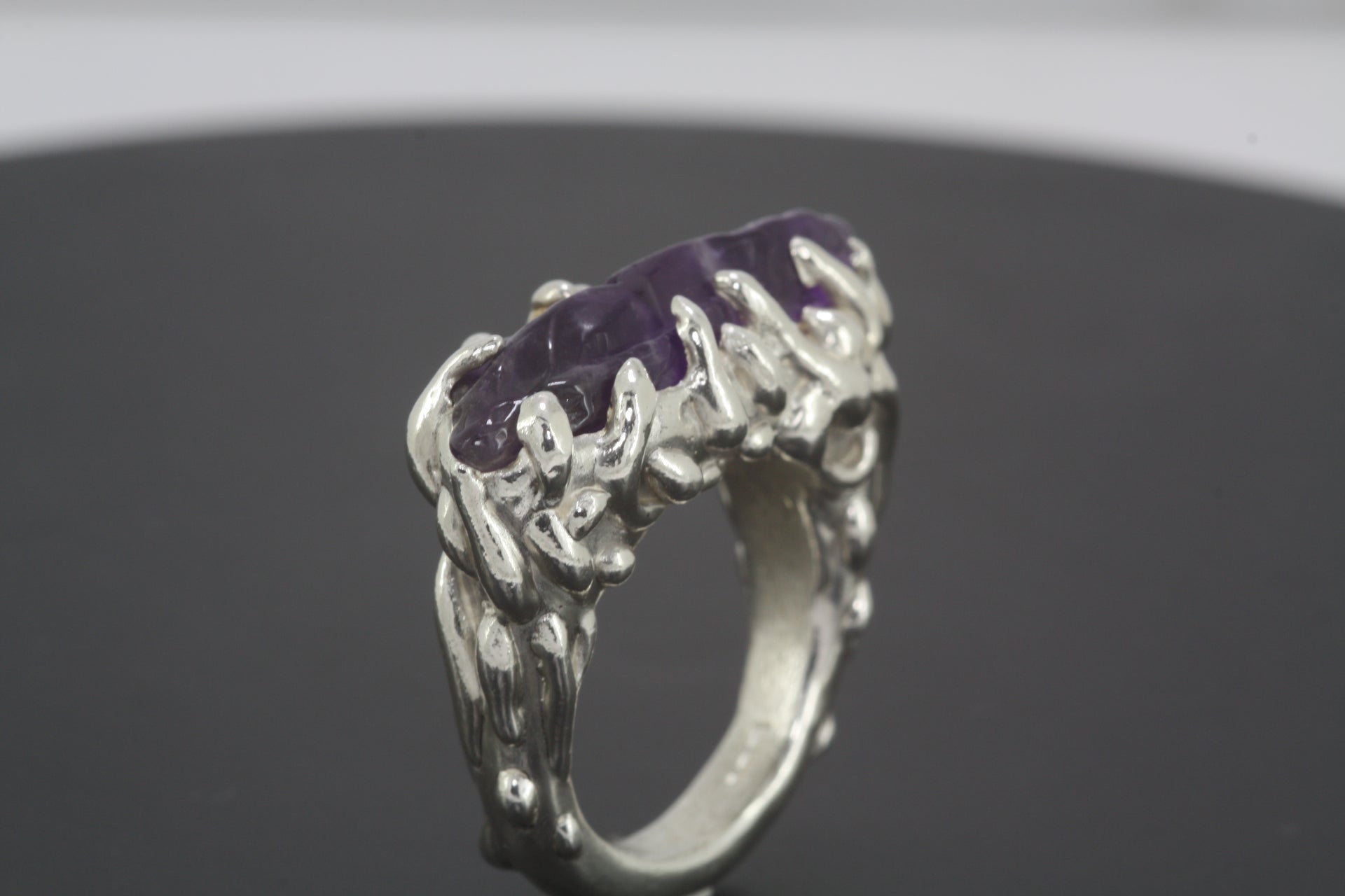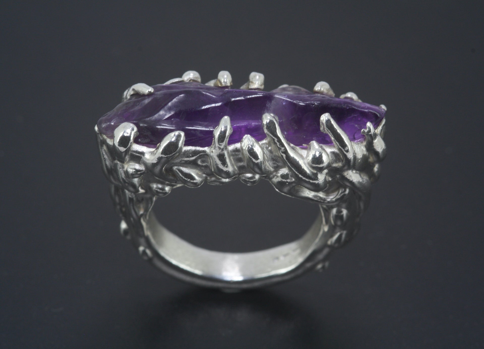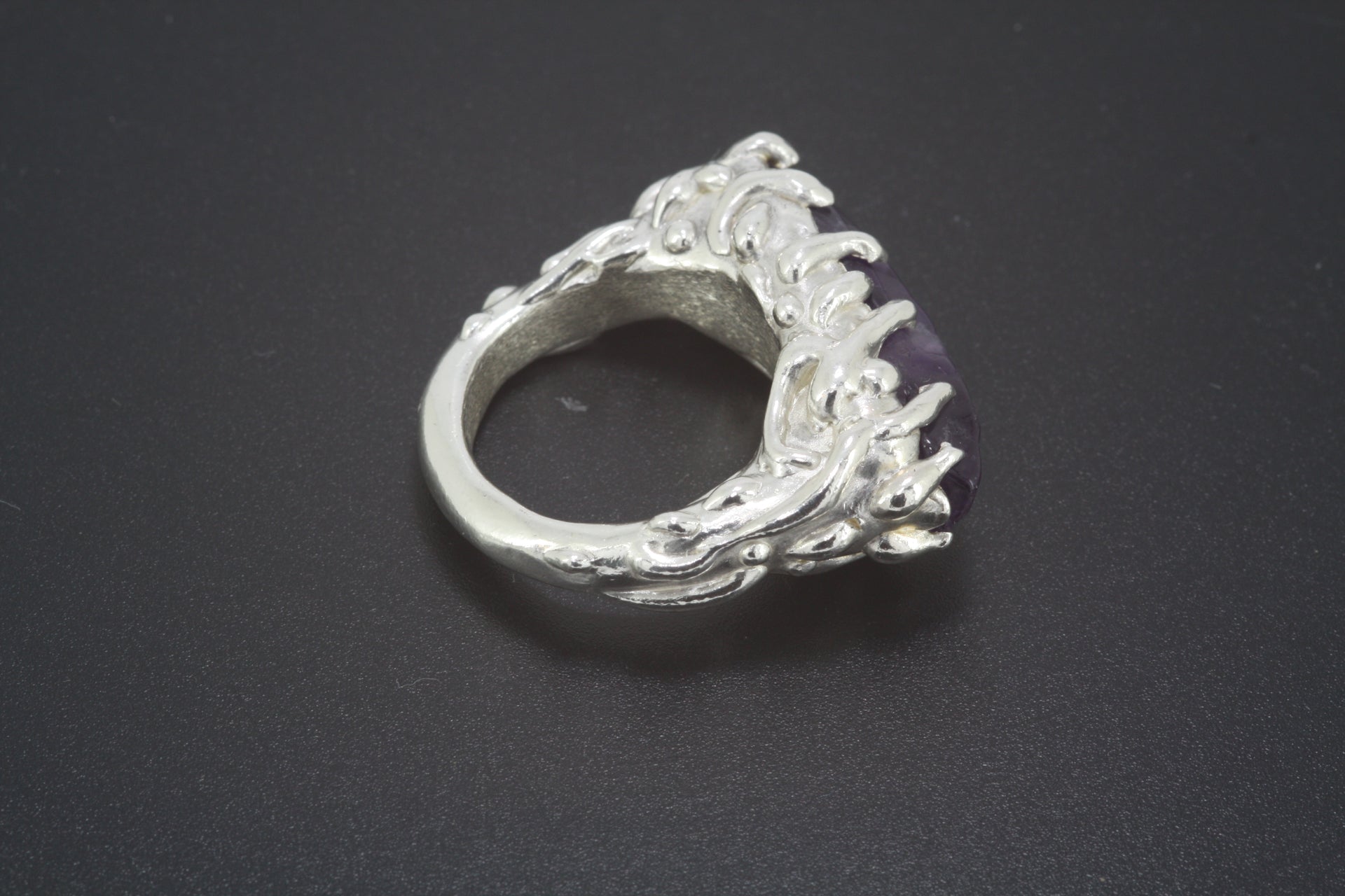 A beautiful chunky sterling silver ring with silver dew drops decorating the band and topped off with a stunning semi-polished amethyst.
