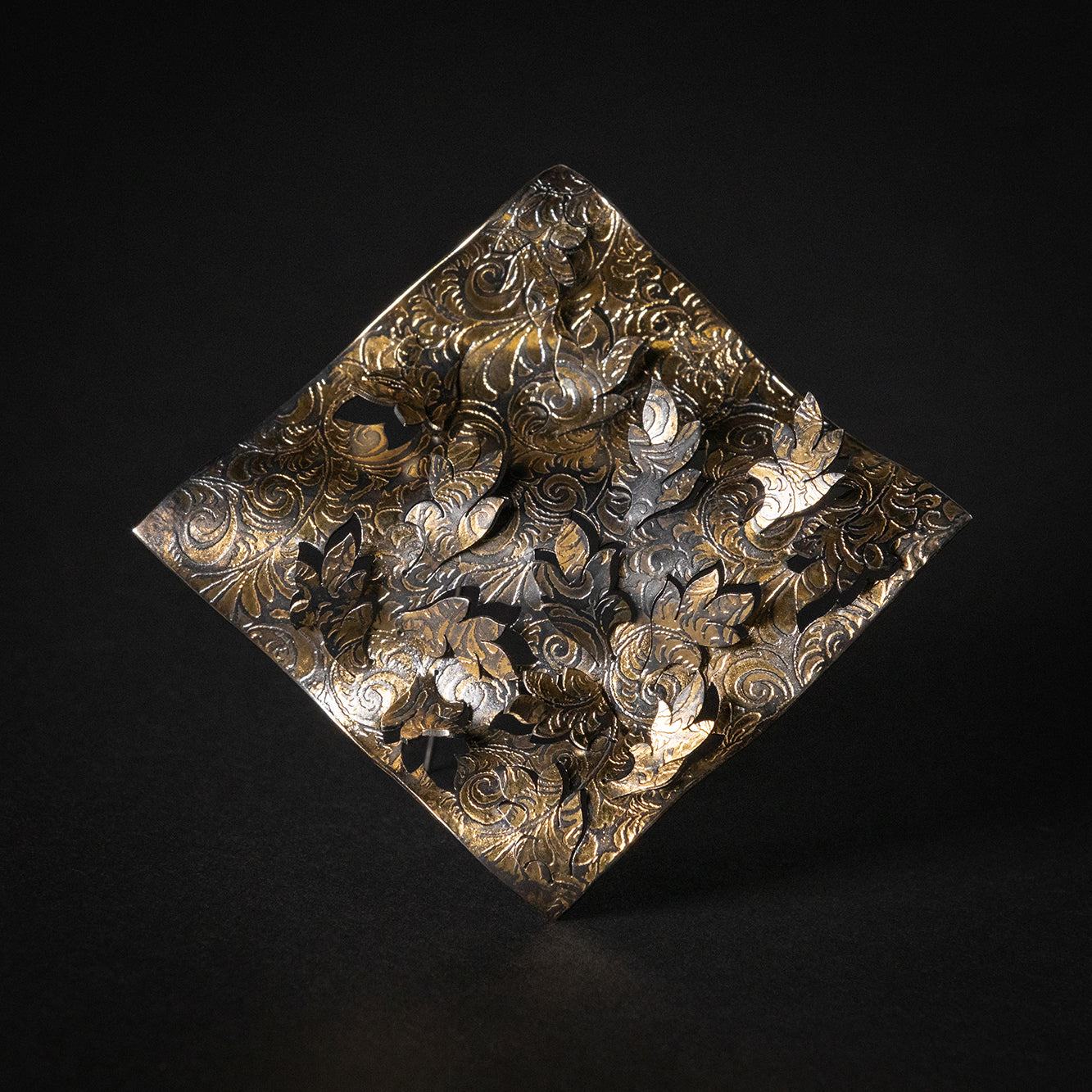 A beautifully textured oxidised sterling silver brooch which has been decorated with 24ct gold foil through the process of Keum Boo and sections meticulously hand pierced. The surface pattern has been formed by rolling the metal and the gold foil highlights this detail wonderfully.