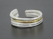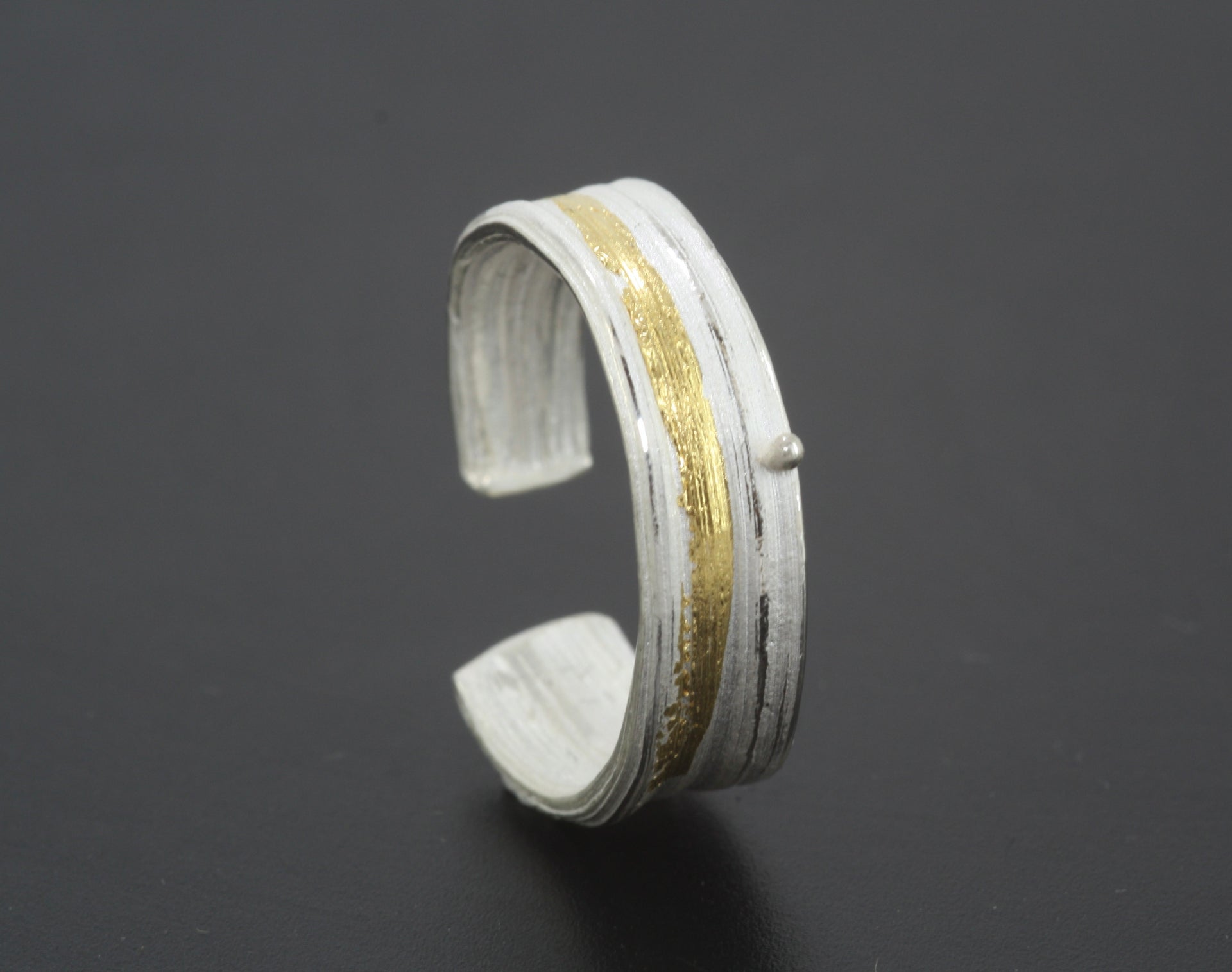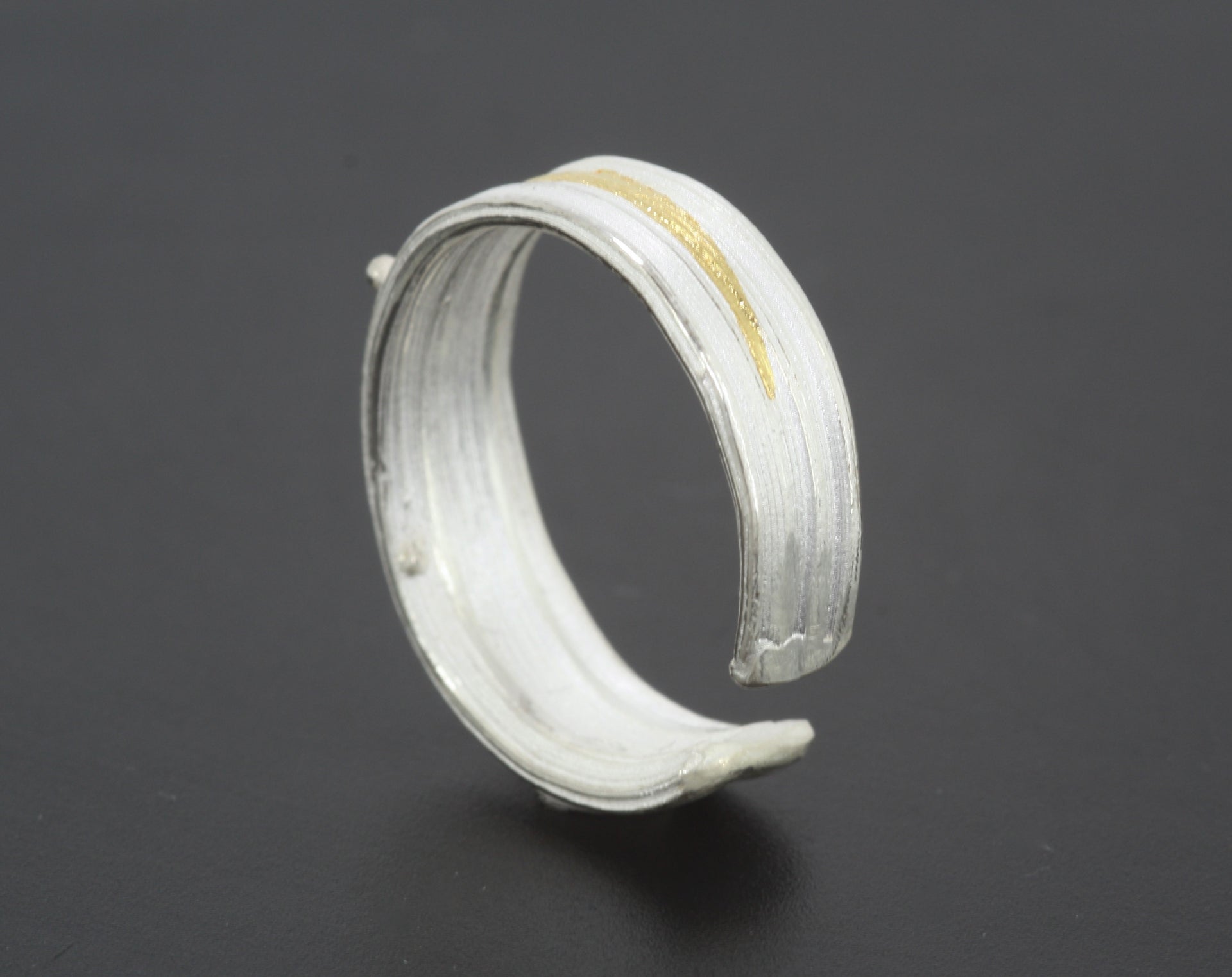 The sterling silver has been specially treated to achieve a luminous whitened finish, while delicate touches of 24ct gold enhance the fluid movement of the lines. This ring is made using Mitsuro Hikime, a lost wax technique using beeswax.