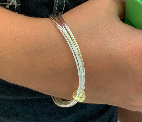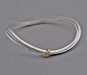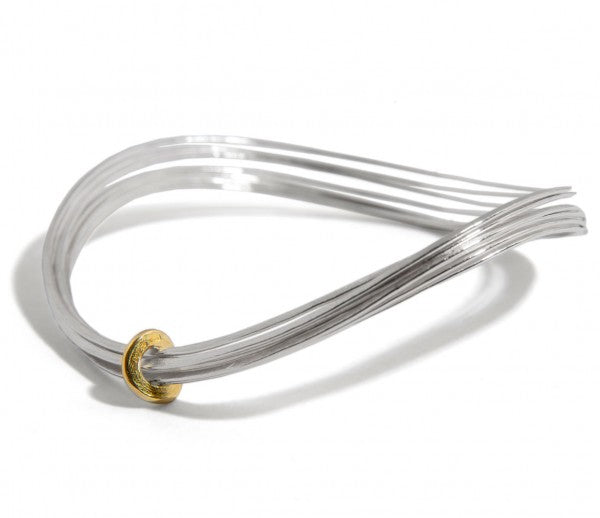 This modern bangle creates the illusion of seven separate bangles while actually being made from a continuous coiled length of beaten silver, making the effect of many fine bangles bound by an 18ct gold ring for a touch of luxury. This hand-forged piece is textured with a shiny hammered finish on one side and a soft satin finish on the other.