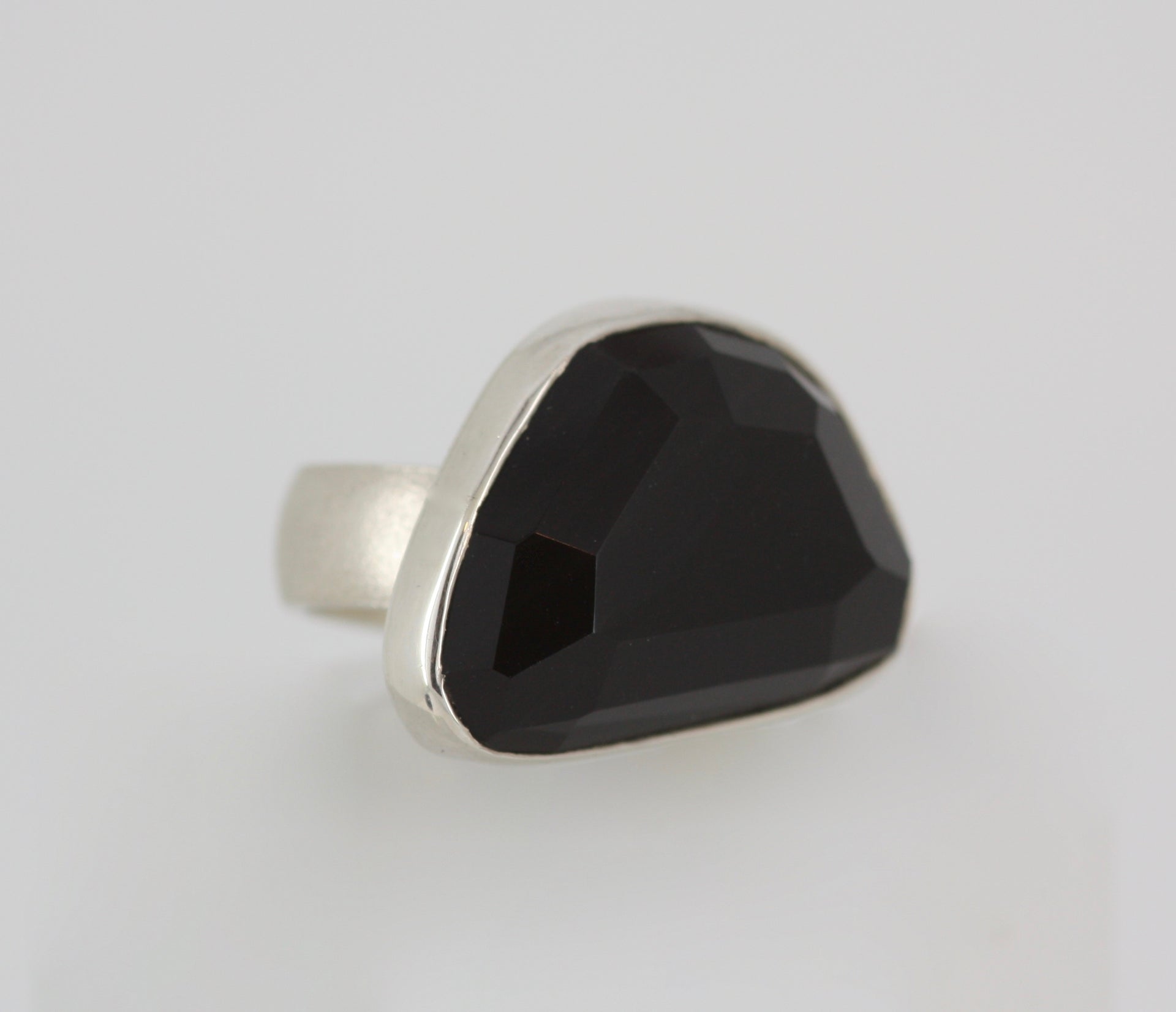 A stunning Faceted black obsidian cabochon set in a polished silver bezel with contrasting frosted silver shank. A true statement piece.