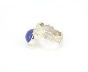 A statement ring featuring a beautiful blue agate cabochon set in a polished silver bezel, set off centre on a kimana wing band. A truly stunning piece that is comfortable to wear and sits perfectly on the finger.