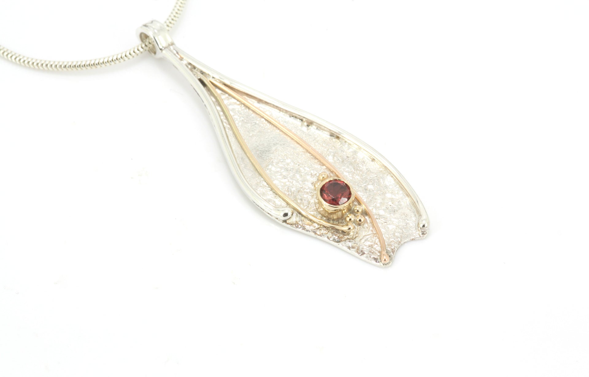 A beautiful pendant, reminiscent of butterfly wings and leaves in the autumn. Reticulated silver adorned with both silver and 9ct gold details result in an elevated pendant with a harmoniously modern and organic finish.
