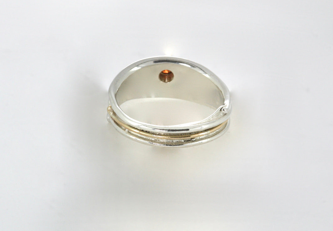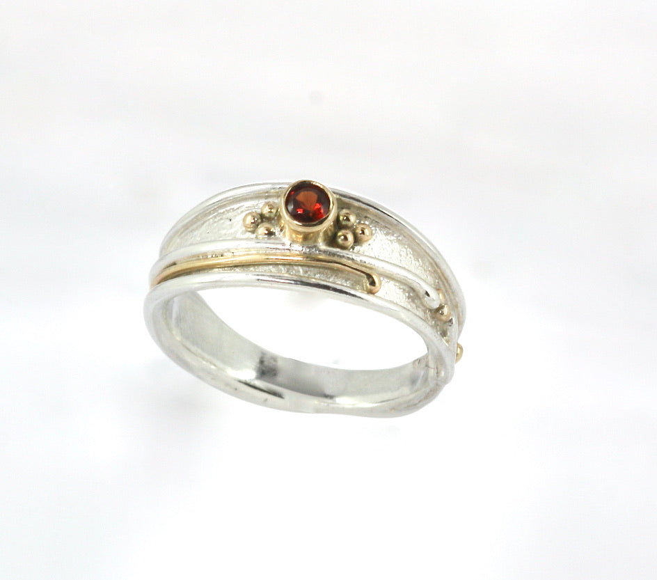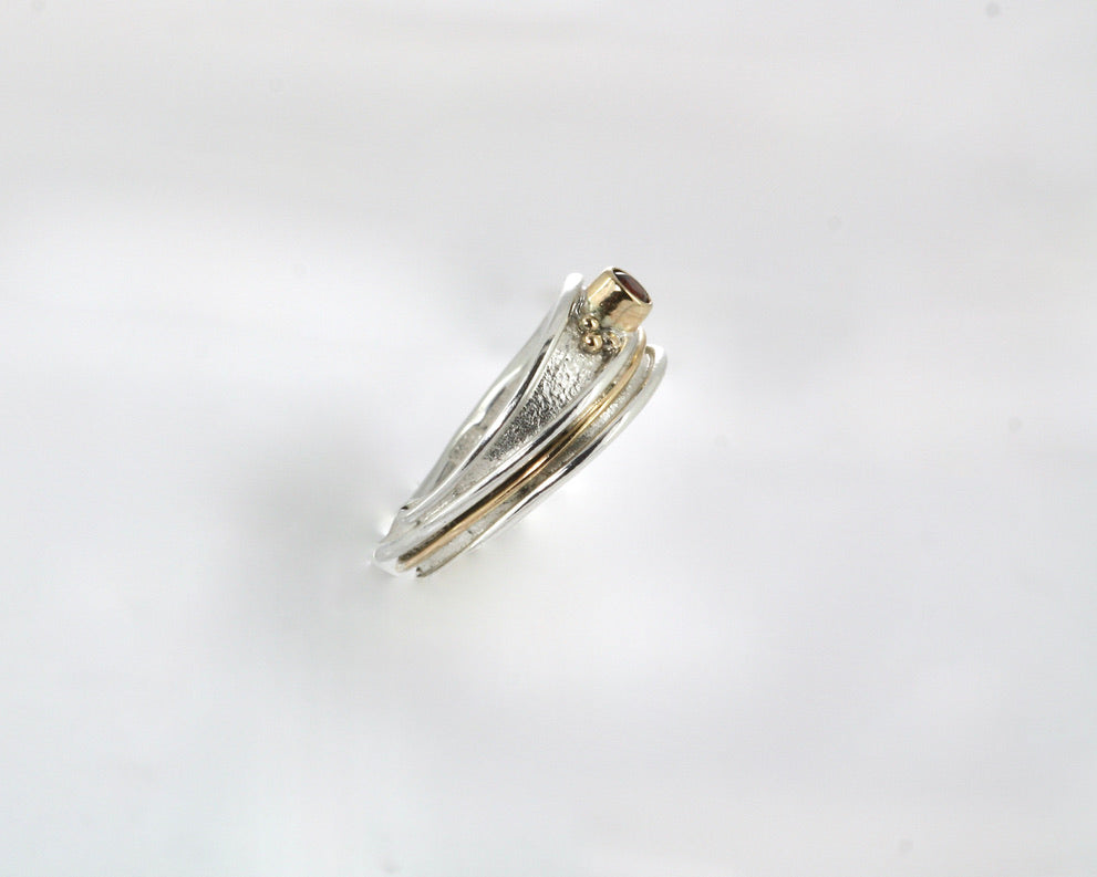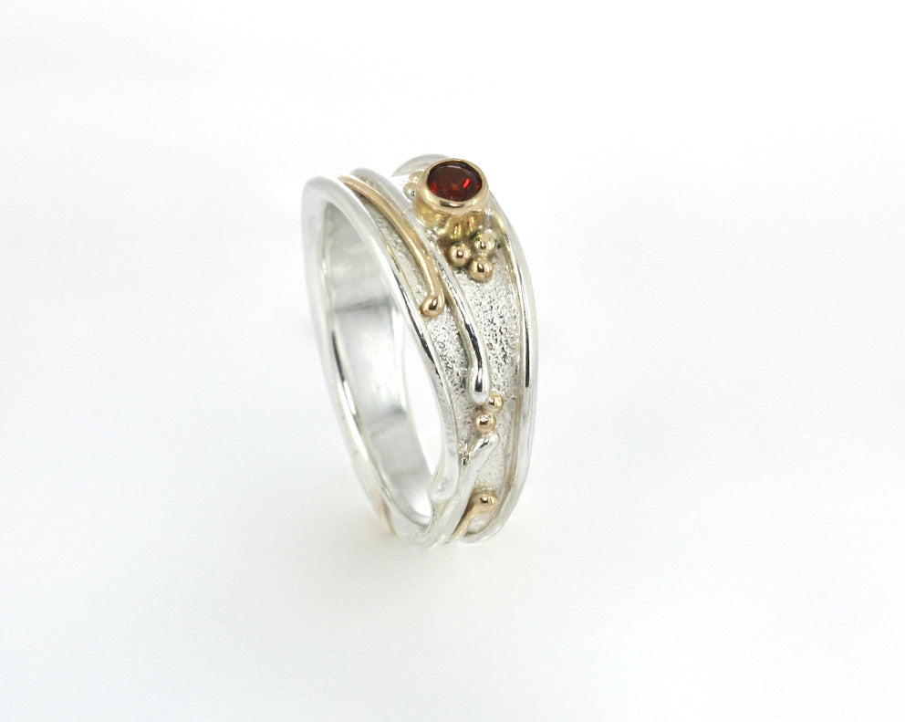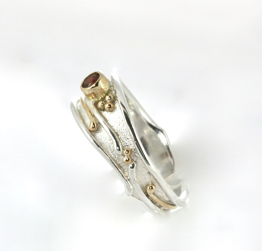 A beautiful undulating silver ring that has been embellished with 9ct gold detail and set with a 3mm Garnet. This ring has a very organic reticulated texture to the band.