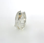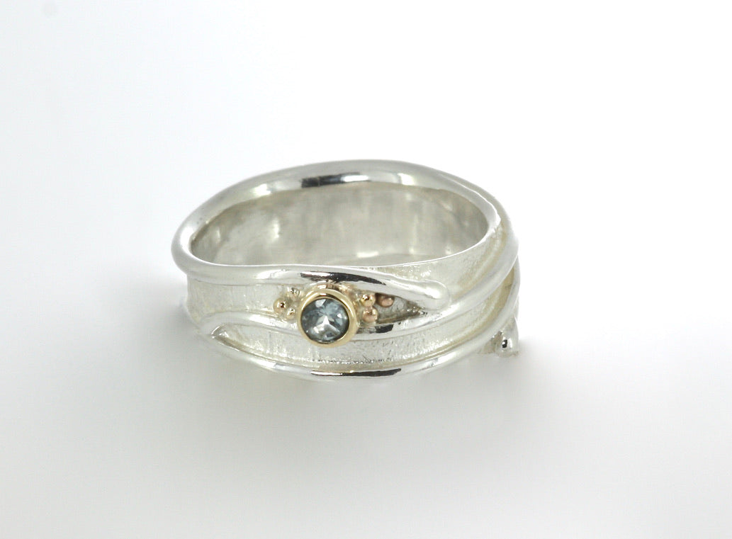 This beautiful undulating silver ring has been embellished with 9ct gold detail and set with a 3mm Topaz. This ring has a very organic reticulated texture to the band.