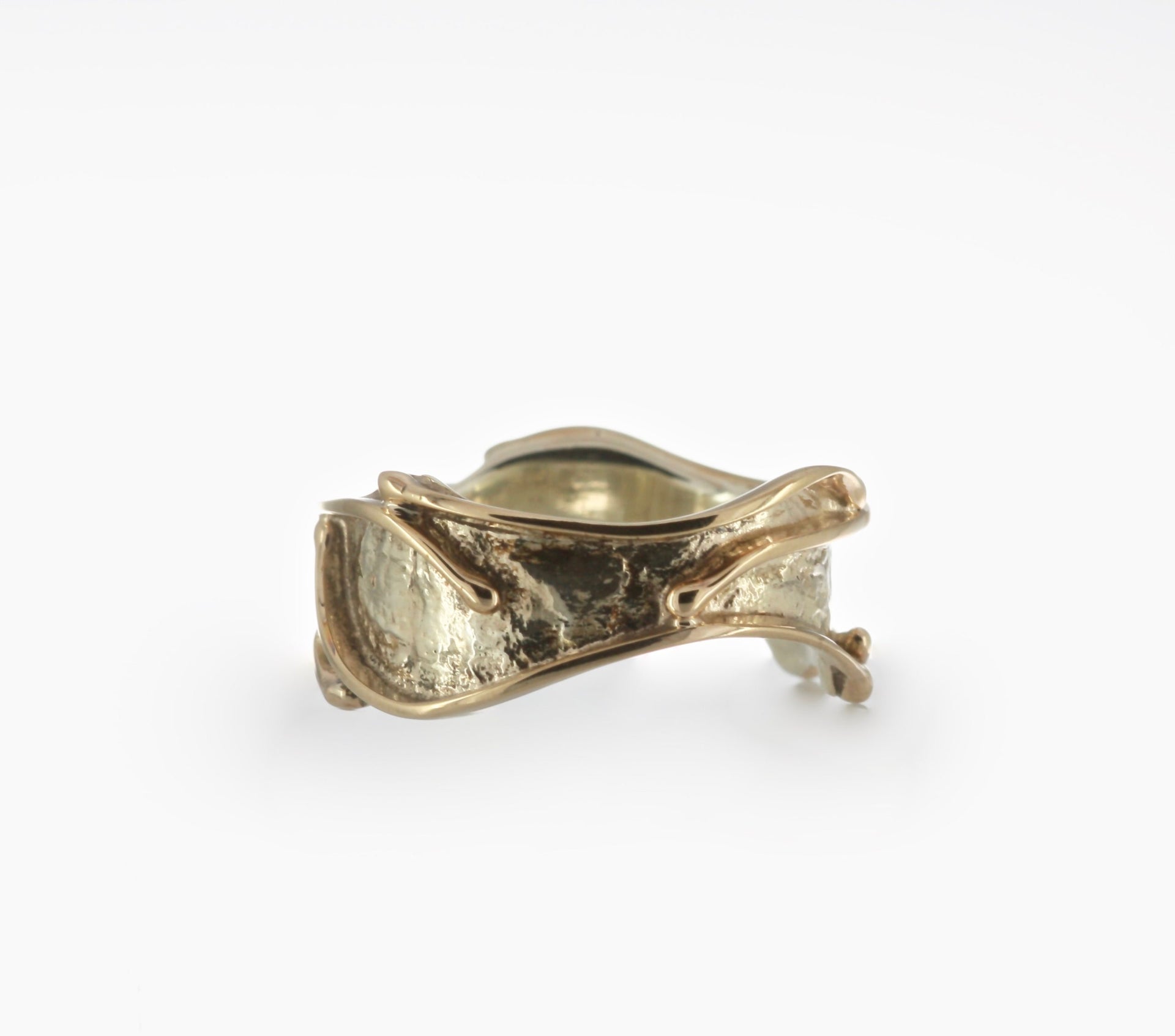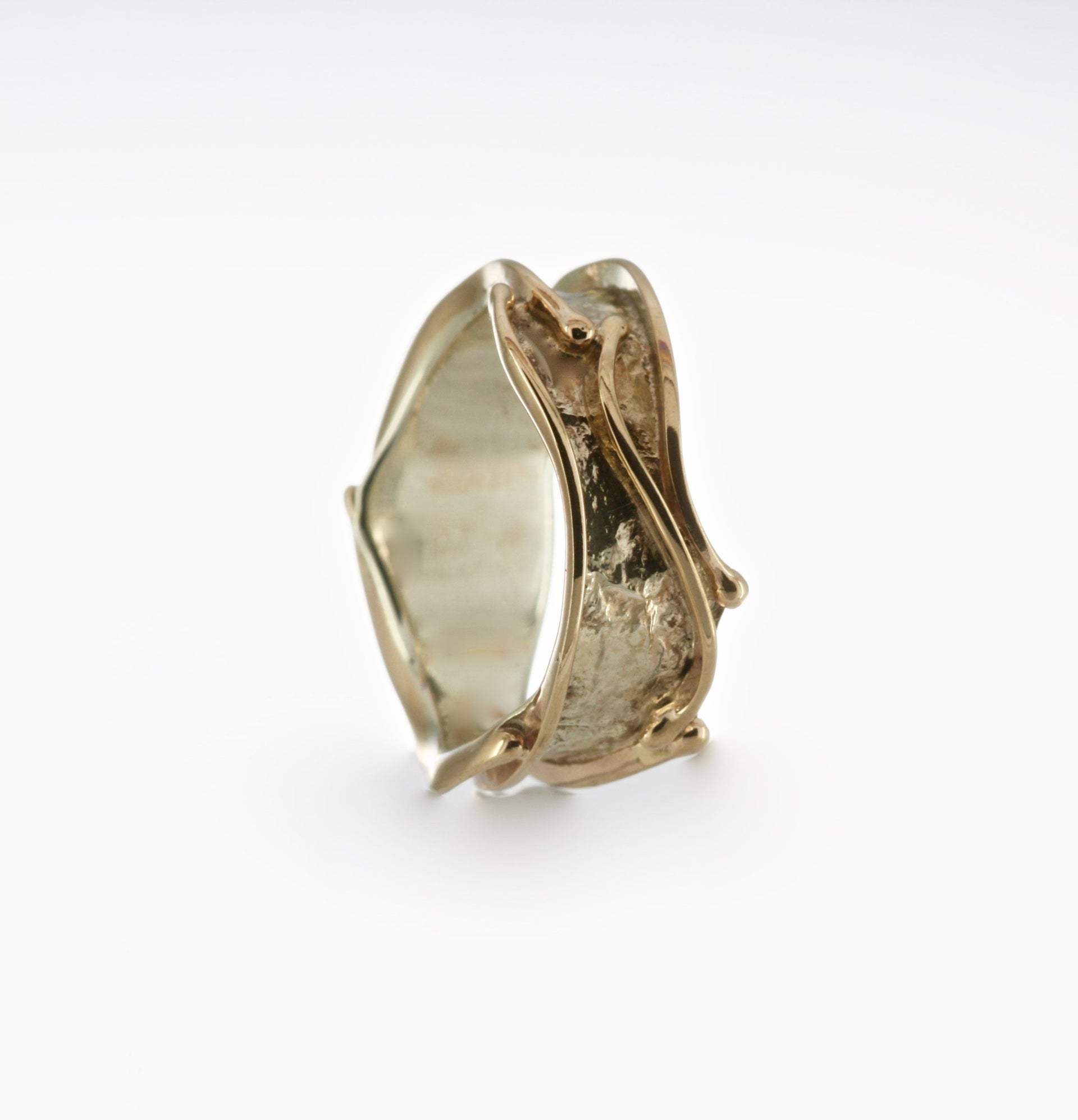 A lovely undulating yellow and white gold ring with a reticulated texture on the outside of the band. It has been embellished with 9ct yellow wire.