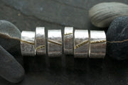 Lucy uses her Granddad’s old workshop hammers to give the surface texture to the silver so each ring has a kind of fingerprint. The gold seam represents the simple geological features of rocks as well as being a gentle reminder of the precious nature of our natural environment in our modern world.