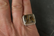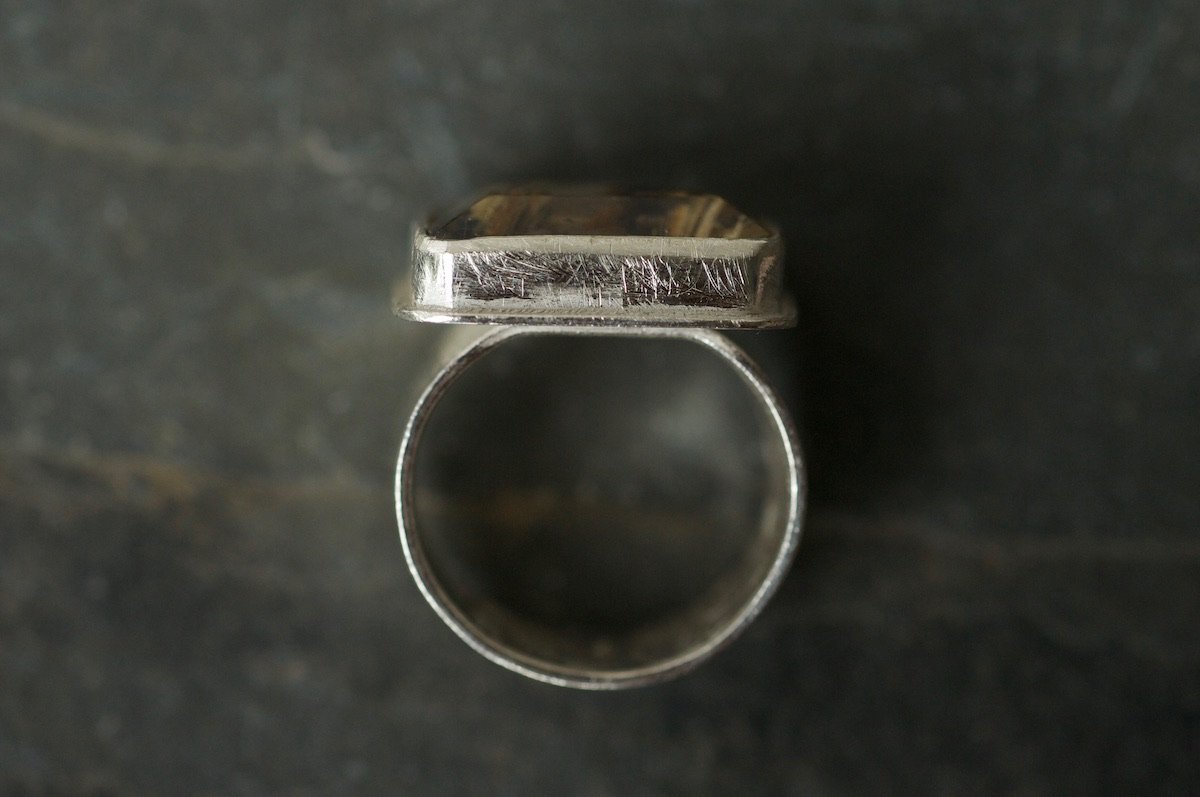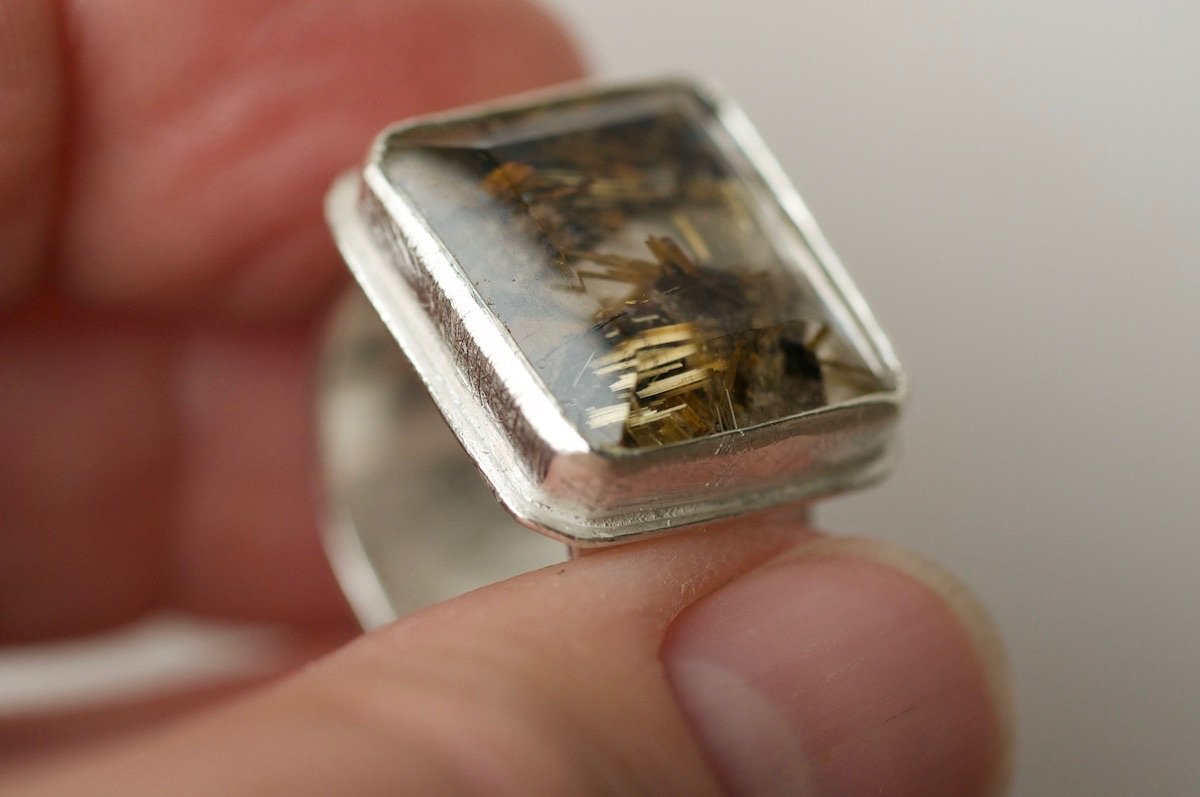 Golden rutile and haematite in quartz simply set into a recycled silver bezel ring to show off the stone’s beautiful details.