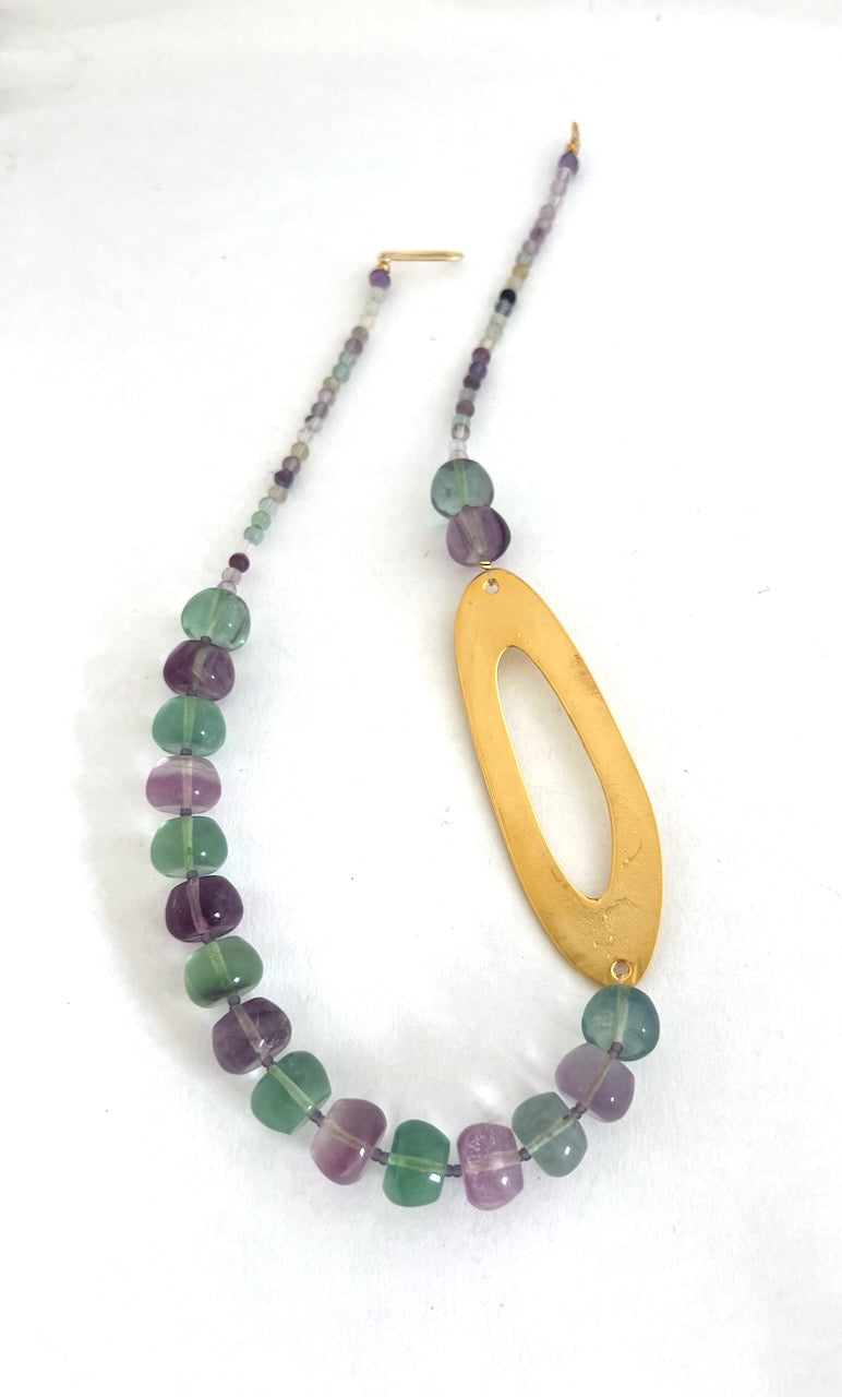 A fantastic statement necklace, featuring fluorite beads in a variety of colours and shades with an offset gold oval. Matching earrings available.
