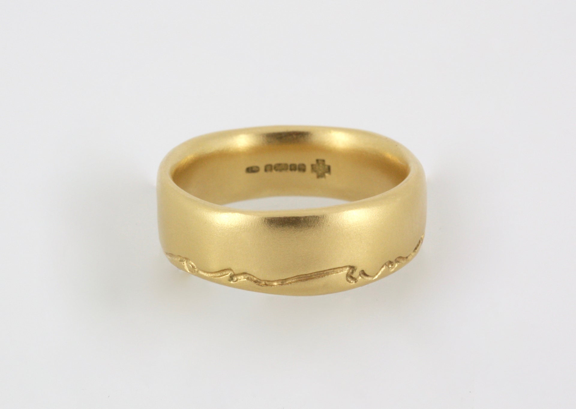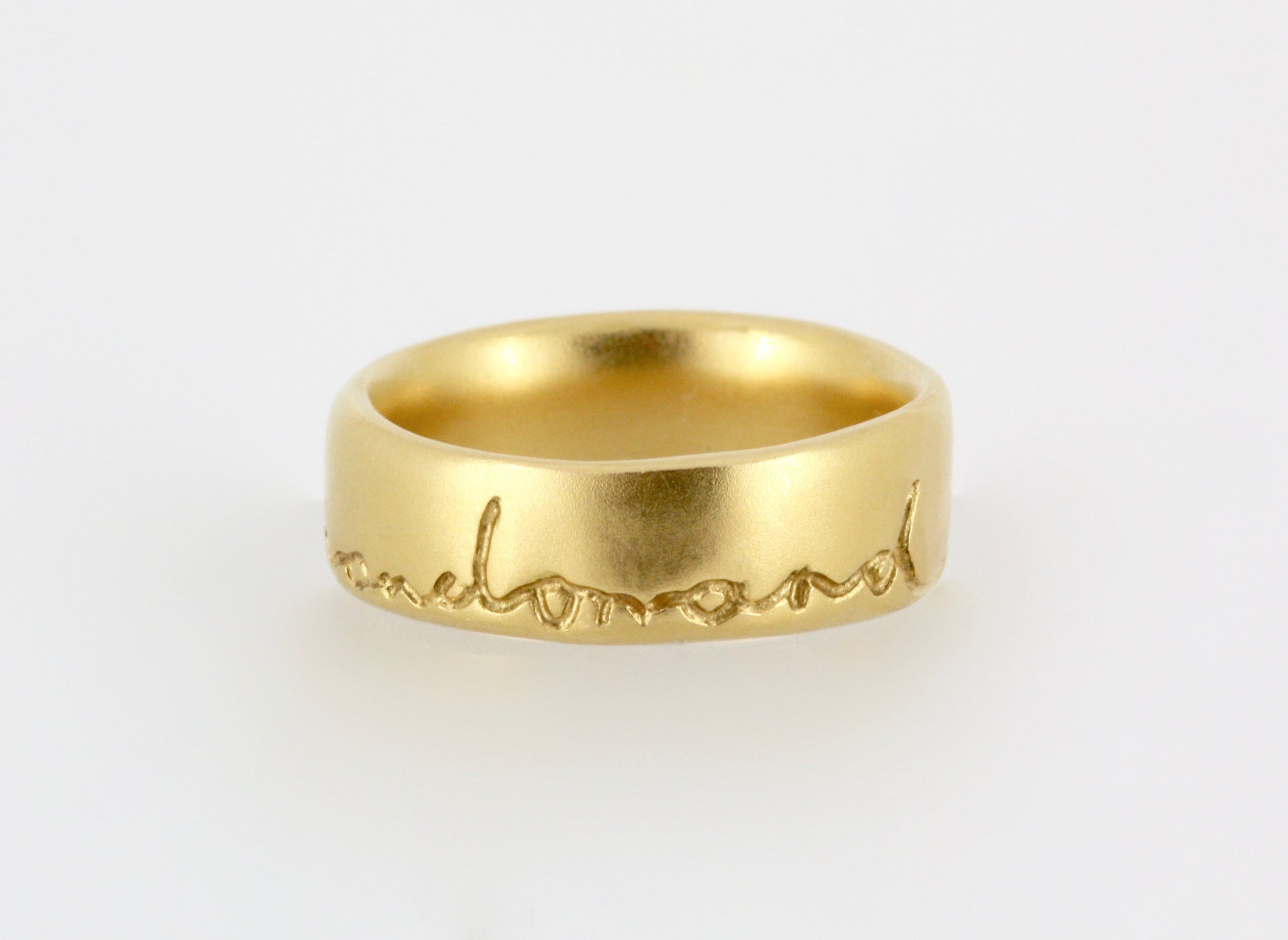 A beautifully crafted 18ct gold ring etched around the outside in lowercase lettering 'on and on.' With a lustrous soft satin finish.