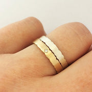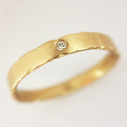 A beautifully understated 9ct gold engagement ring with nibbled edges. These rings are perfect for everyday wear and are often chosen as an alternative, handmade wedding and engagement ring. The nibbled edges and a unique satin finish gives these rings an eroded, organic feel.