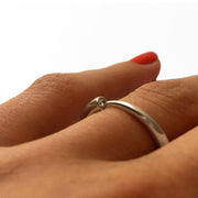 A delicate and unusual and sculptural ring, tapering from 3mm to 1.5mm with a 2mm diamond for a subtle sparkle.