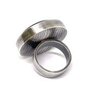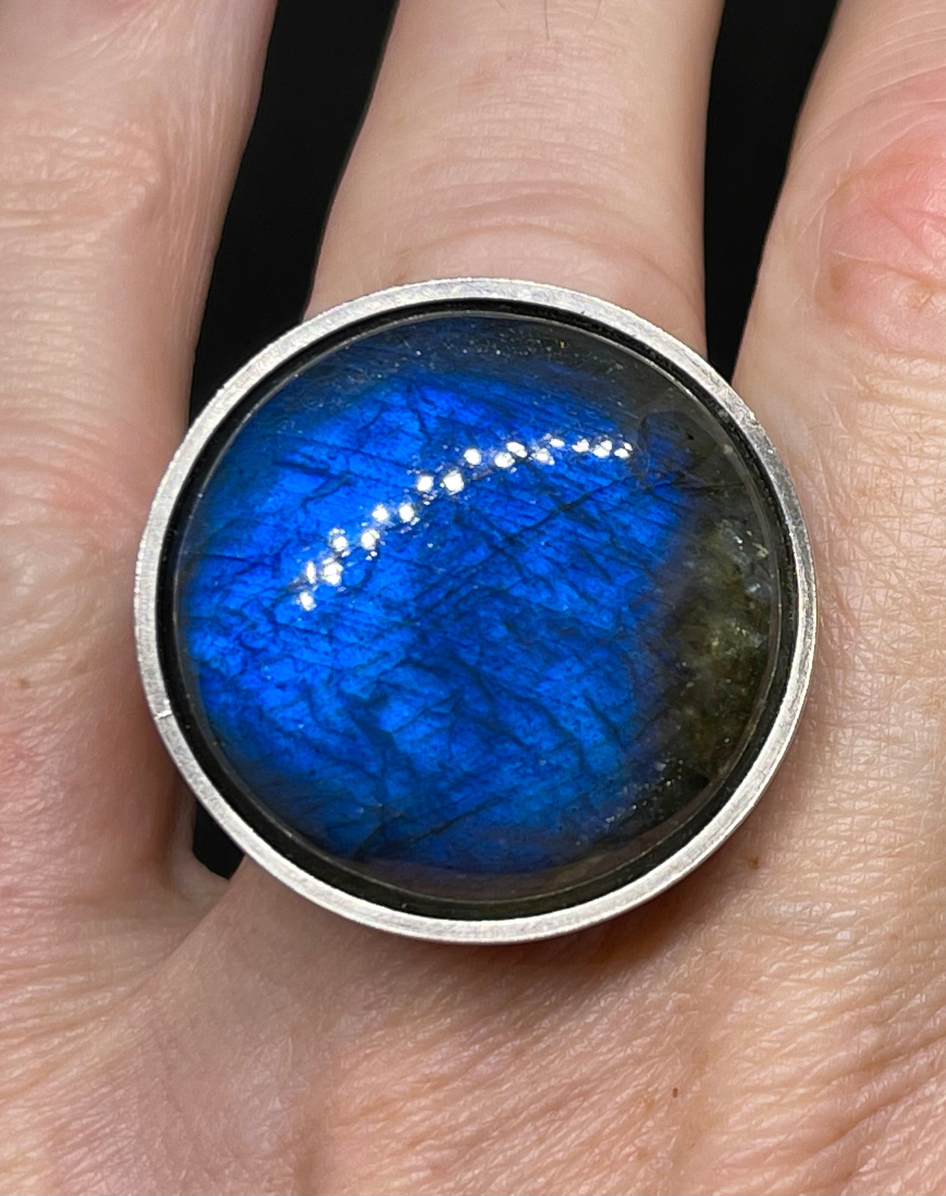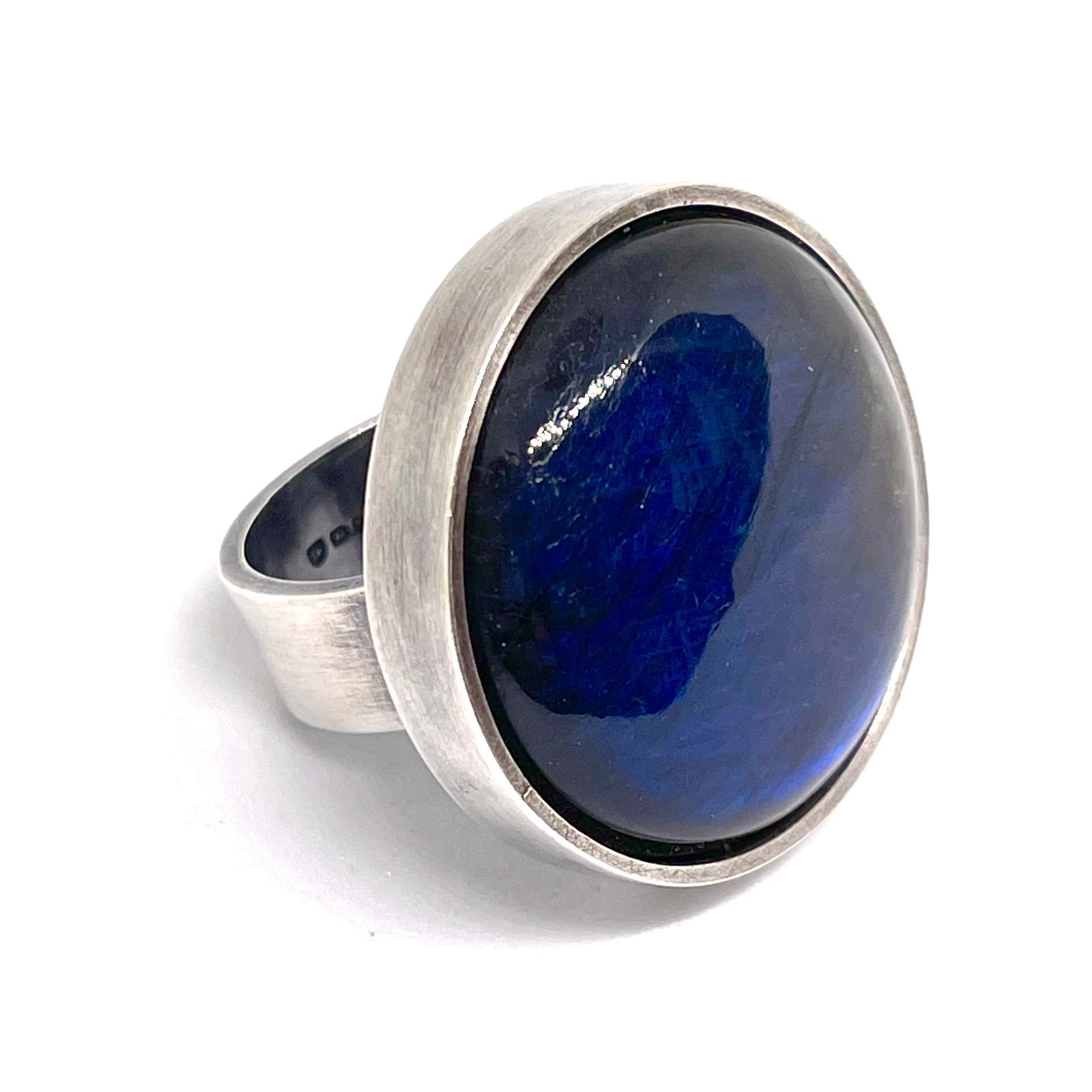 A beautifully chunky statement ring with a stunningly blue labradorite cabochon. This would make a fantastic cocktail ring, but is comfortable enough for daily wear.
