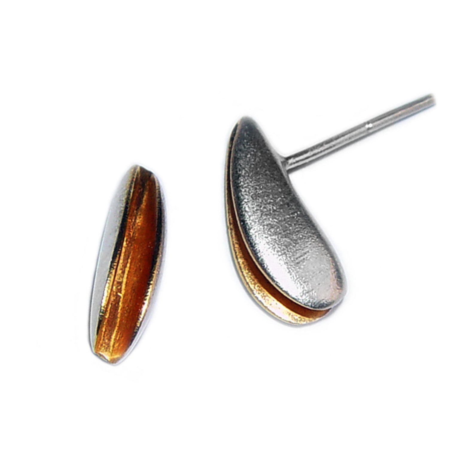 Stylish front split shell studs with a rich 22ct gold plated interior. These simple sterling silver earrings have a natural organic form. They are elegant and comfortable to wear and are practical and suitable for any occasion. They have a simple ear post and bell scroll fixing.