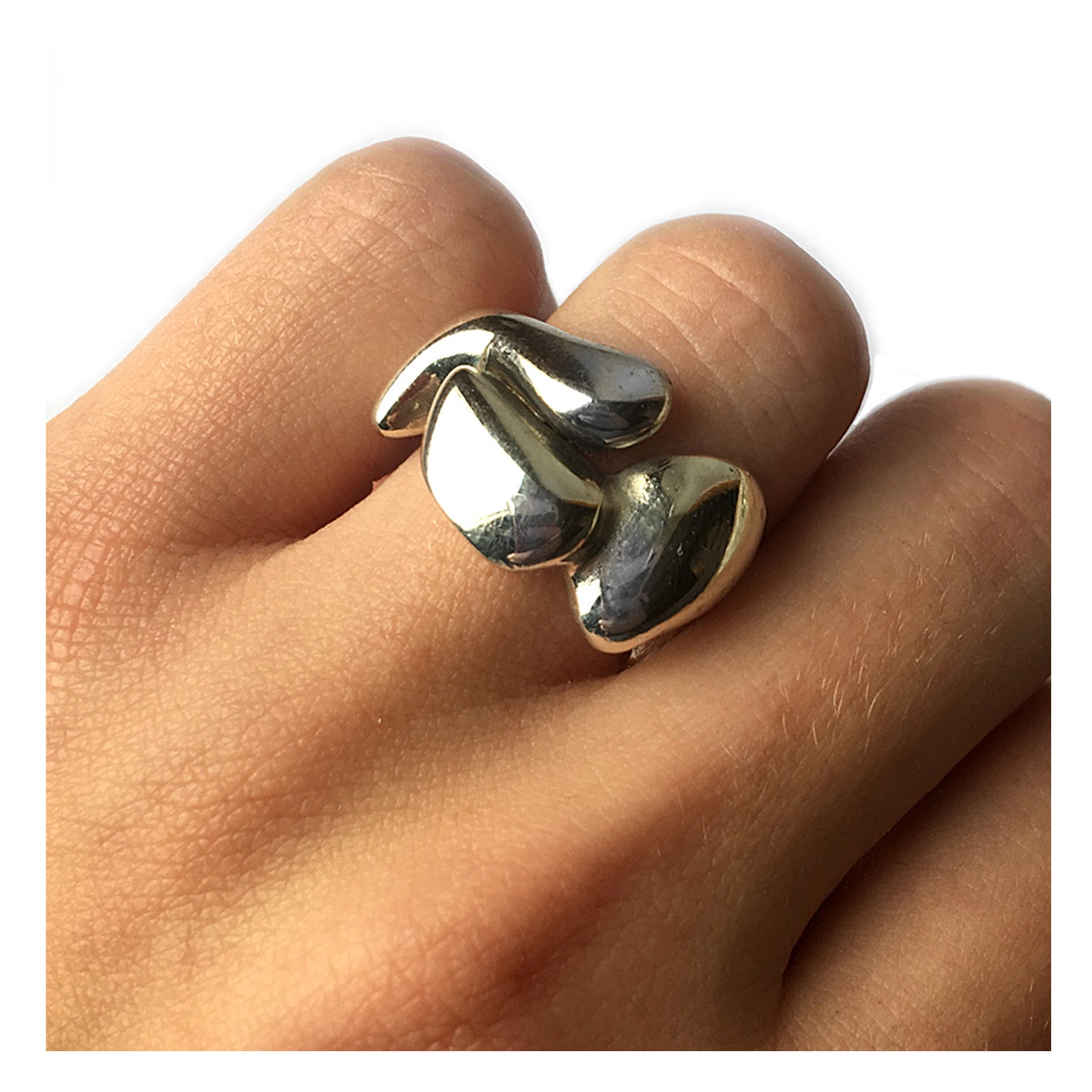 The solid silver sculptural ring is smooth, tactile, and perfectly weighted.