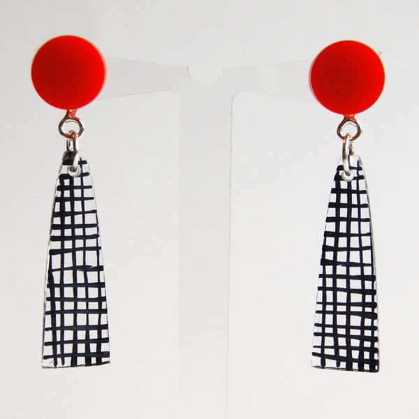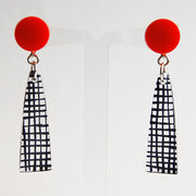 Earrings inspired by the colours, shapes and patterns of the Mid Century Modern designers. A clear acrylic shape with black weave pattern hangs from a brightly coloured circle stud top.