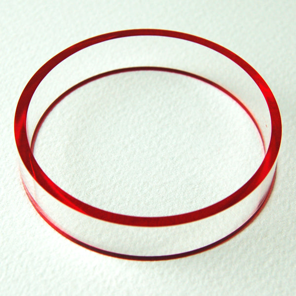 A lovely clear acrylic bangle with a red edge that shows its colour when viewed at an angle. This is a small fitting bangle with an internal diameter of 60mm.
