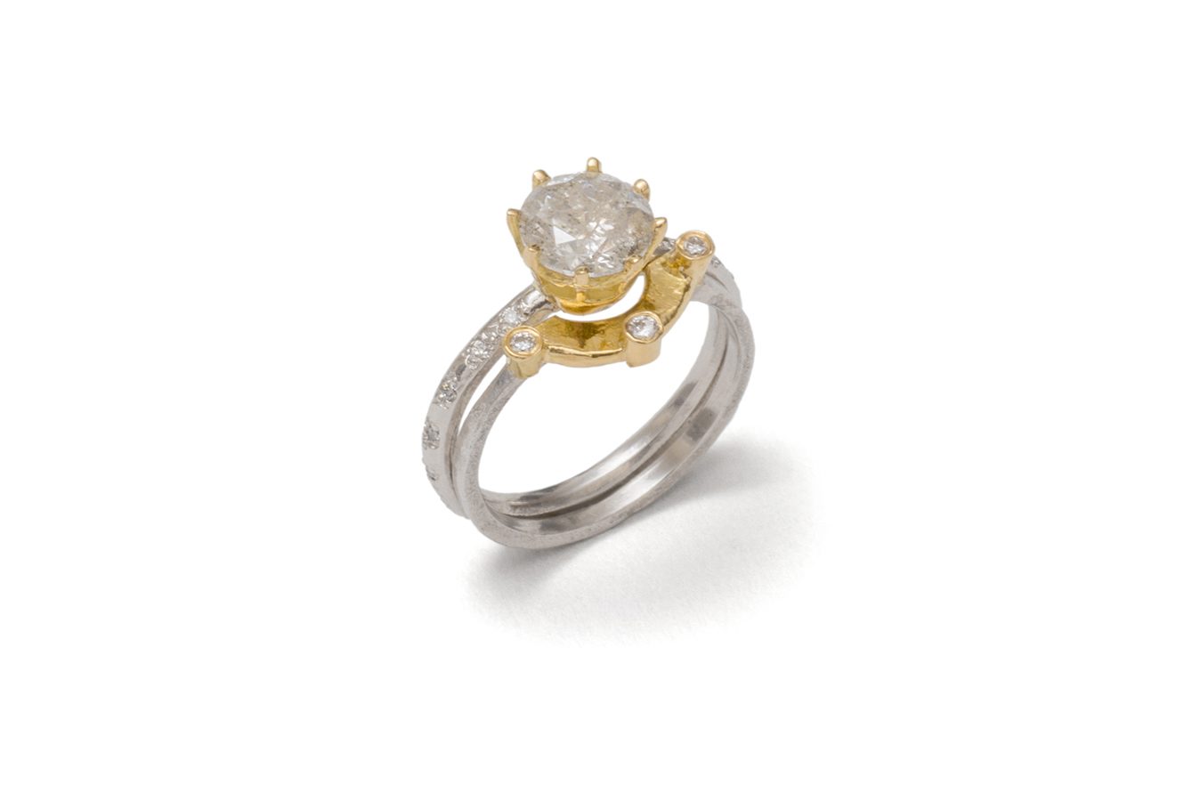 A simple and beautiful wedding ring which is shaped to fit with most of Shimara's engagement rings, but can be custom ordered to fit any her rings. It has a soft organic yet geometrical feel to it.
