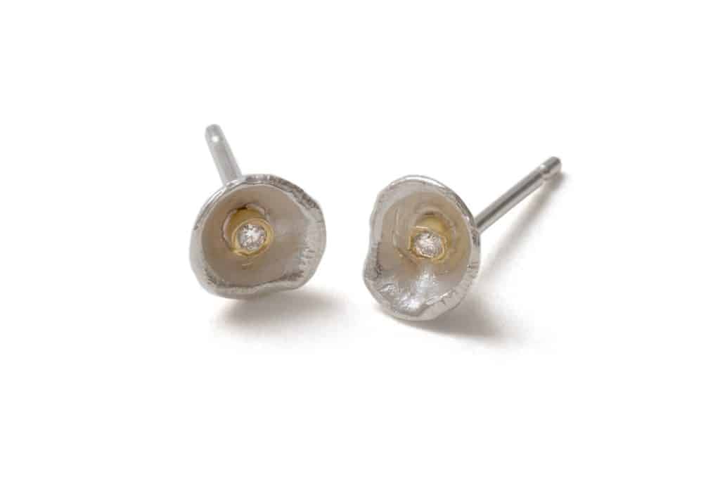 Reticulated silver formed cups with small round brilliant cut diamonds collet set in beautiful warm 18ct gold, these studs are beautifully elegant and simple.