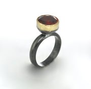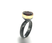 Inspired by clusters of pods and flowers this wonderfully versatile ring can be worn in a variety of ways. Created from oxidised hand-formed silver it has a stunning dark red garnet set in an 18ct gold gum nut setting.