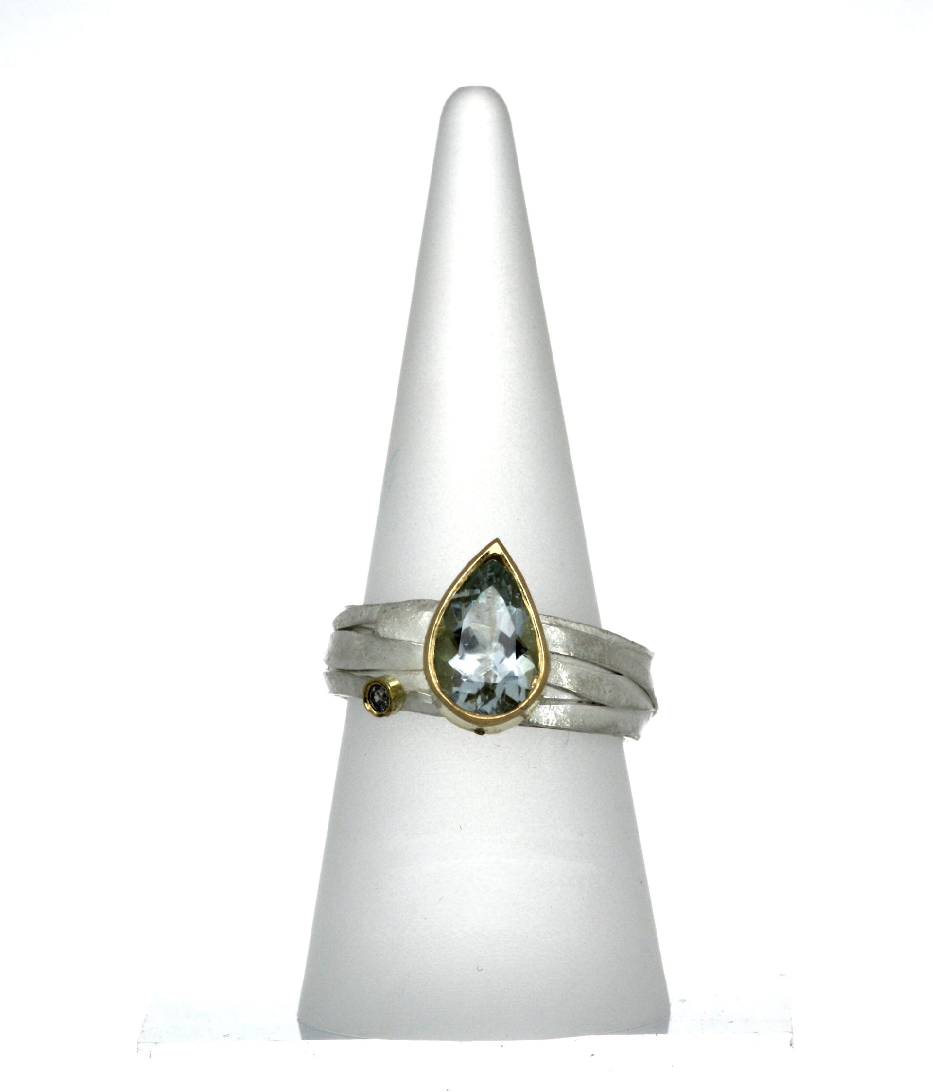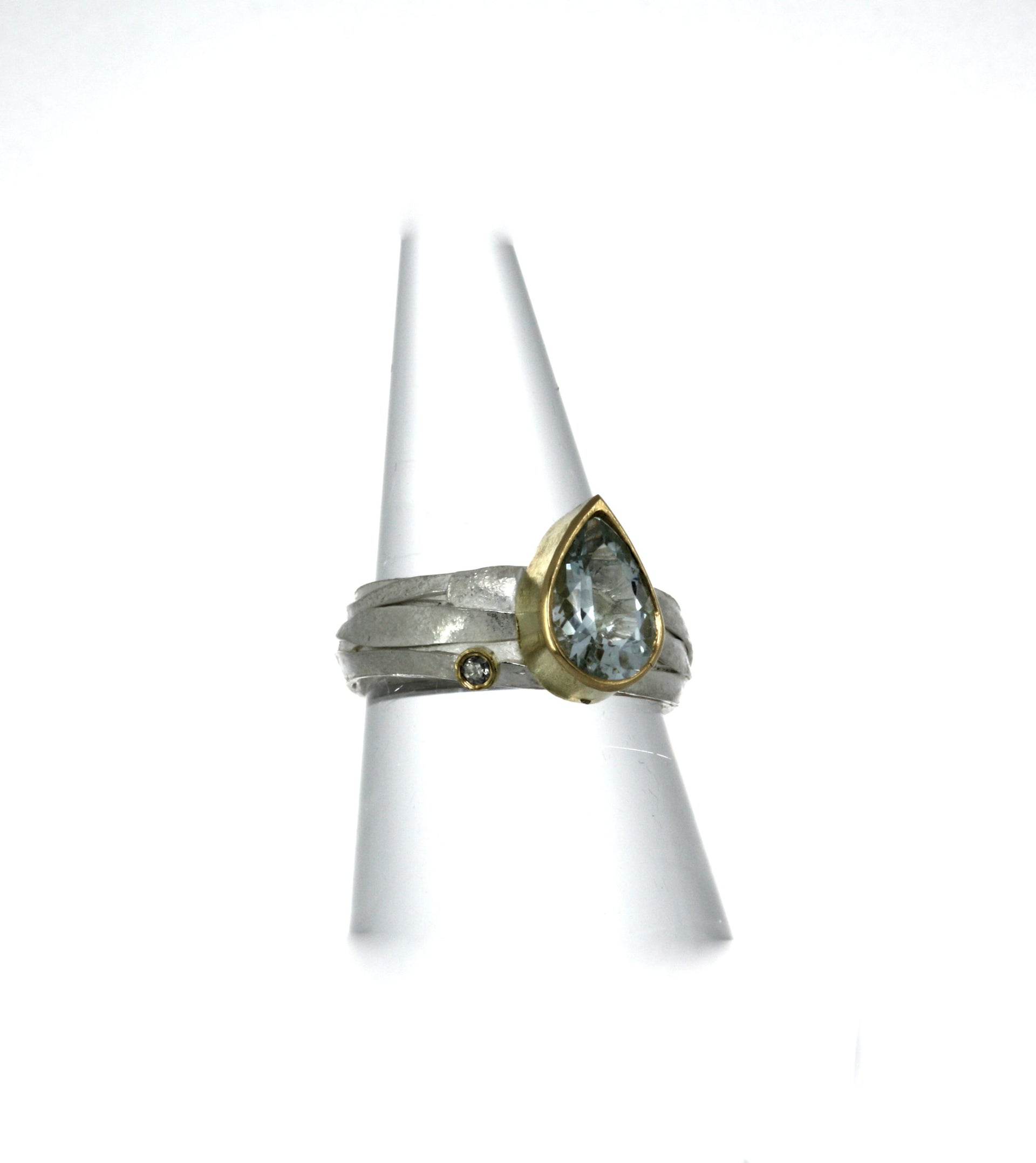 This beautiful silver ring is handcrafted from textured silver, wrapped and woven with a stunning pear shaped aquamarine and diamond both set in 18ct gold. Truly unique !!
