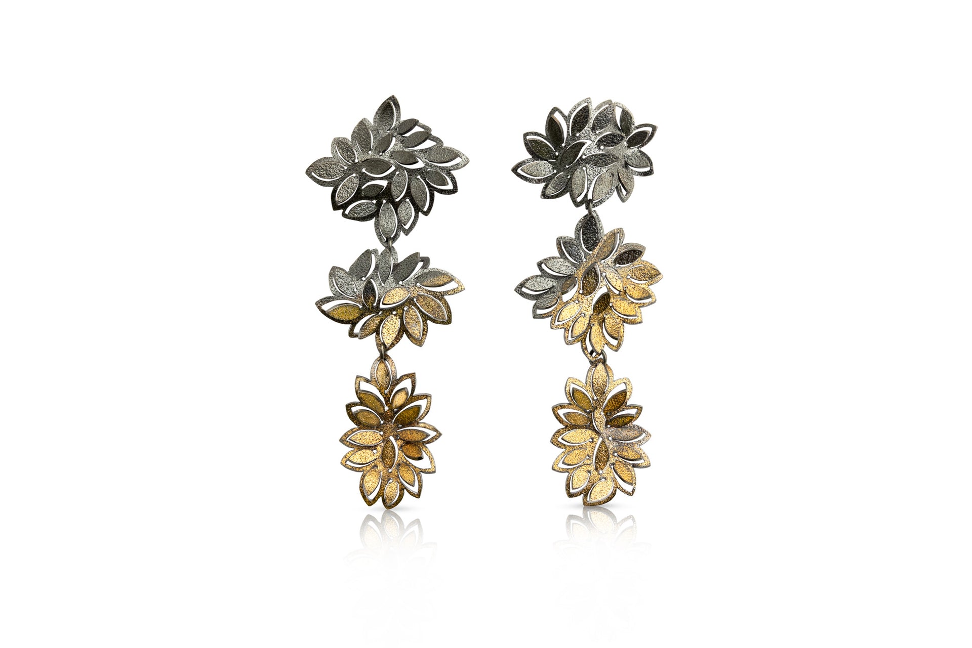 Each petal has been meticulously hand-pierced and then decorated with 24ct gold foil through the process of Keum Boo The gold gently fades to black through oxidisation of the silver. A stunning pair of earrings that are easy to wear and have wonderful movement.