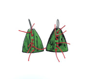 These wonderful, unusual contemporary earrings are certainly eye-catching. Green enamel is complemented beautifully with a red silk thread and oxidised silver wires. Easy and comfortable to wear.