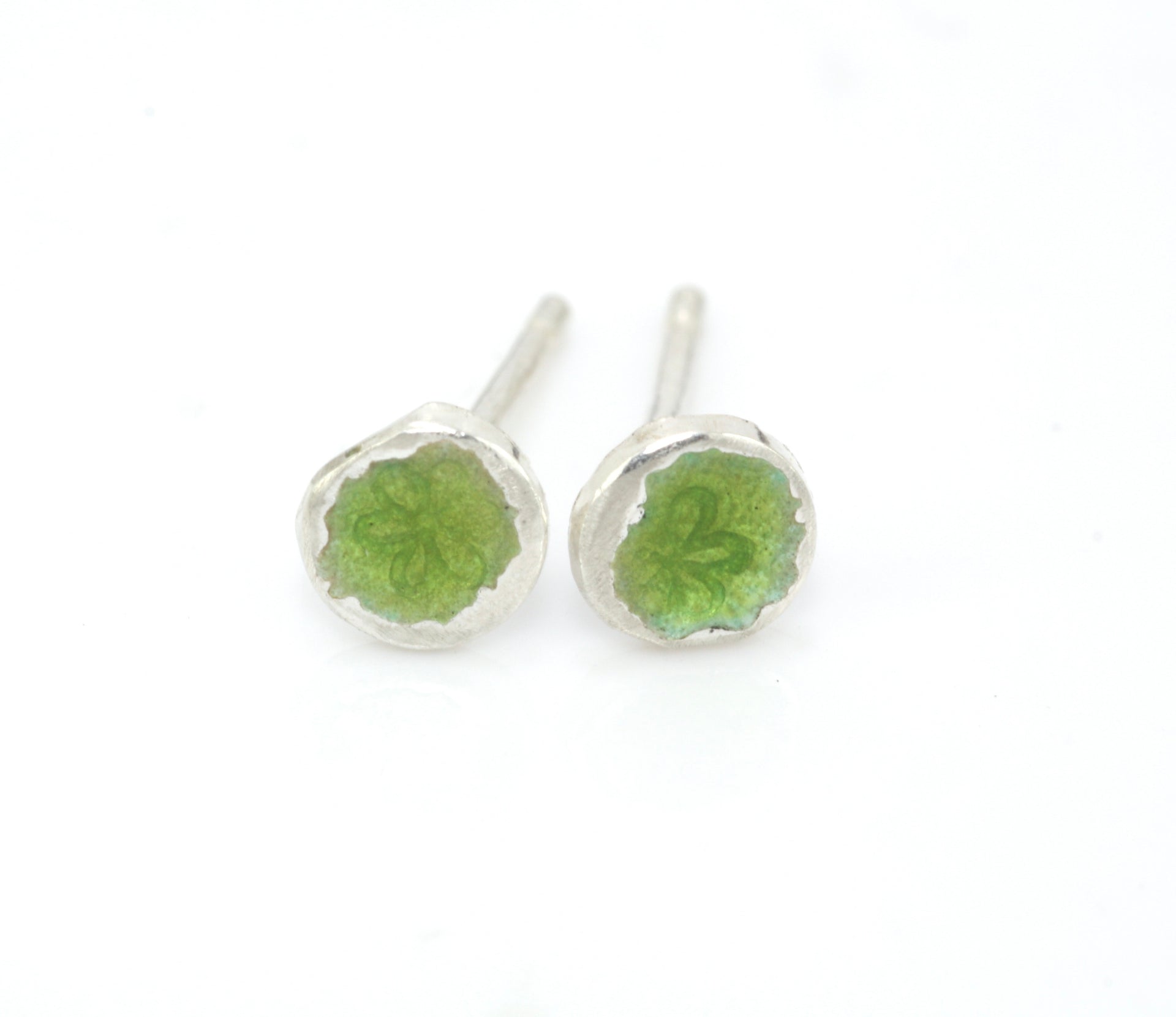 Stunning small enamel stud earrings with delicate detail. Handcrafted on tiny pieces of silver using beautiful green vitreous enamel. Perfect to wear on every occasion.