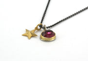 This beautiful necklace delivers on style, detail and wearability. The silver has been oxidised throughout to set off the 18ct gold setting and gold plated leaf charm. The rhodolite garnet glows when caught in the right lighting