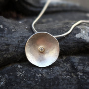 A hammered hand formed silver cup, set with a tiny diamond in 18ct gold and hung on a 1mm snake chain, this pendant is beautifully elegant and simple.