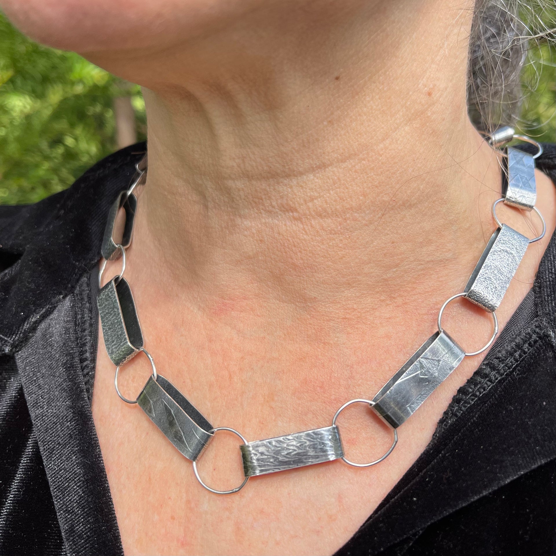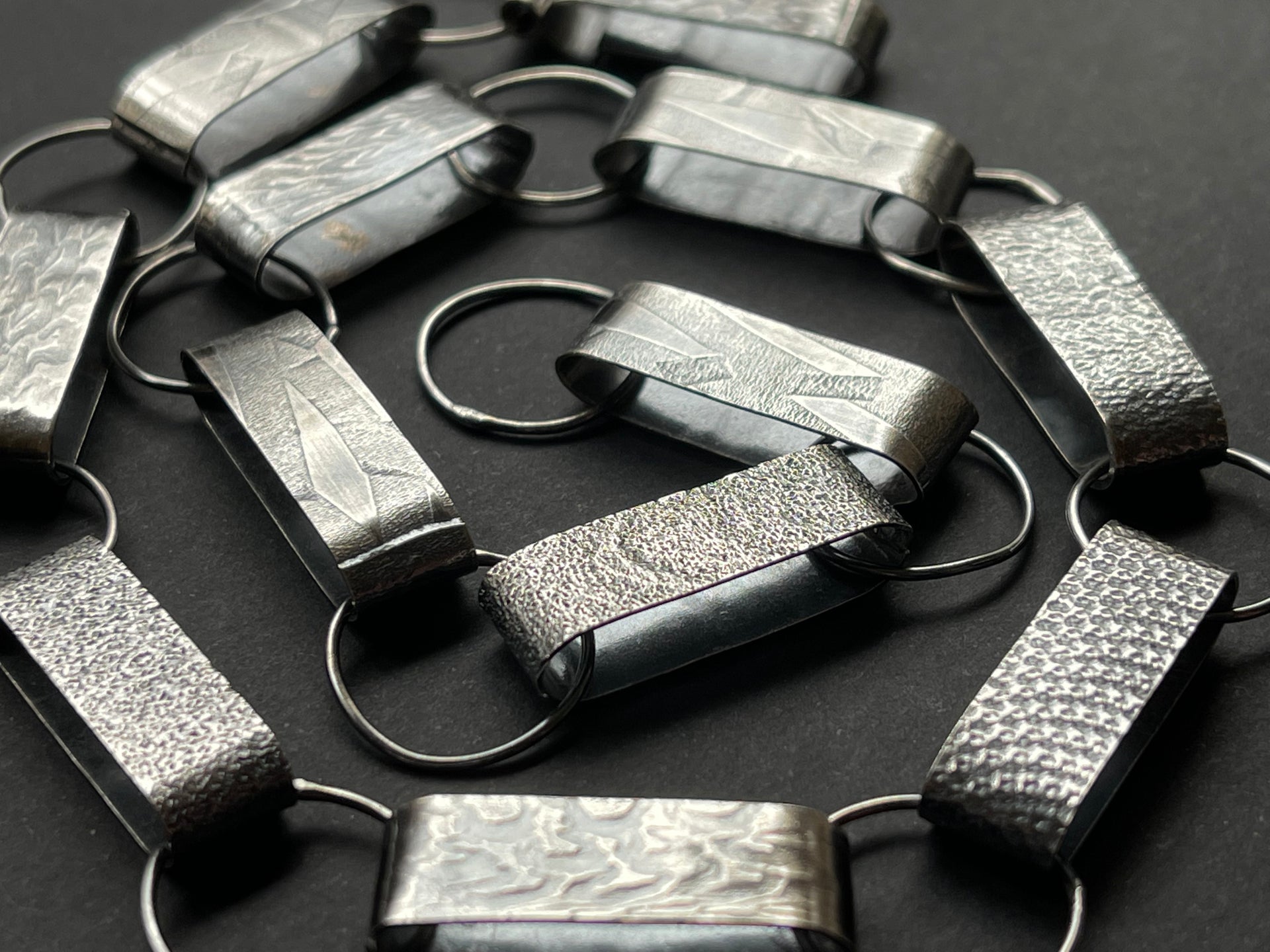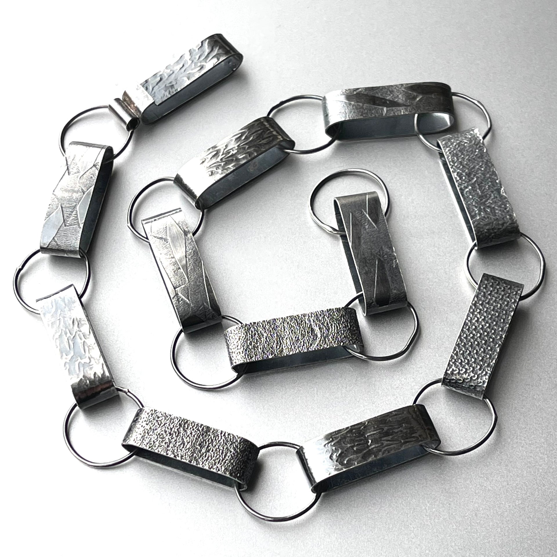Each individual link is hand forged and textured to create a beautiful easy to wear chain necklace. The chain can be worn on it's own for a statement look or layered effortlessly with Neil's other chains.