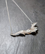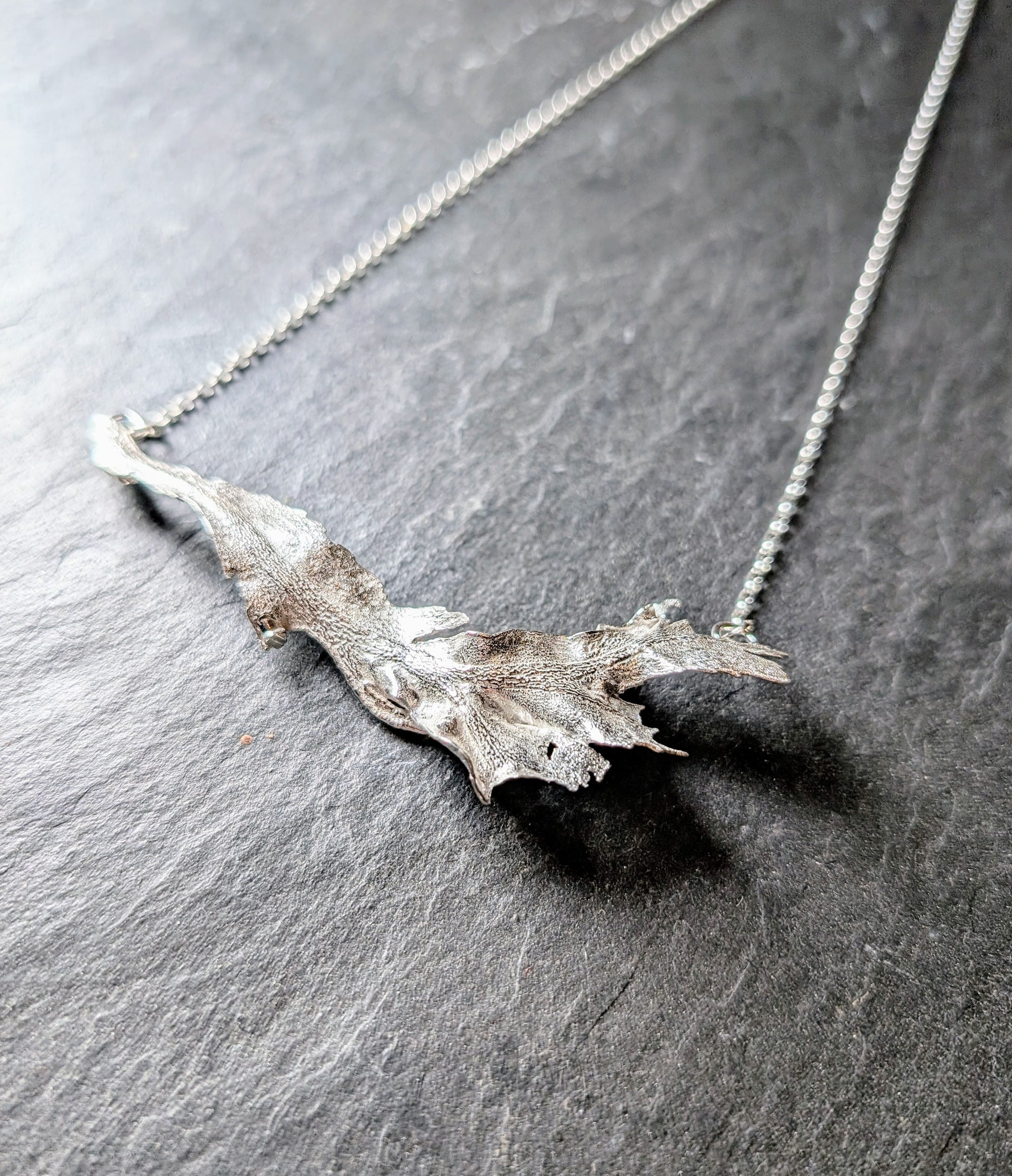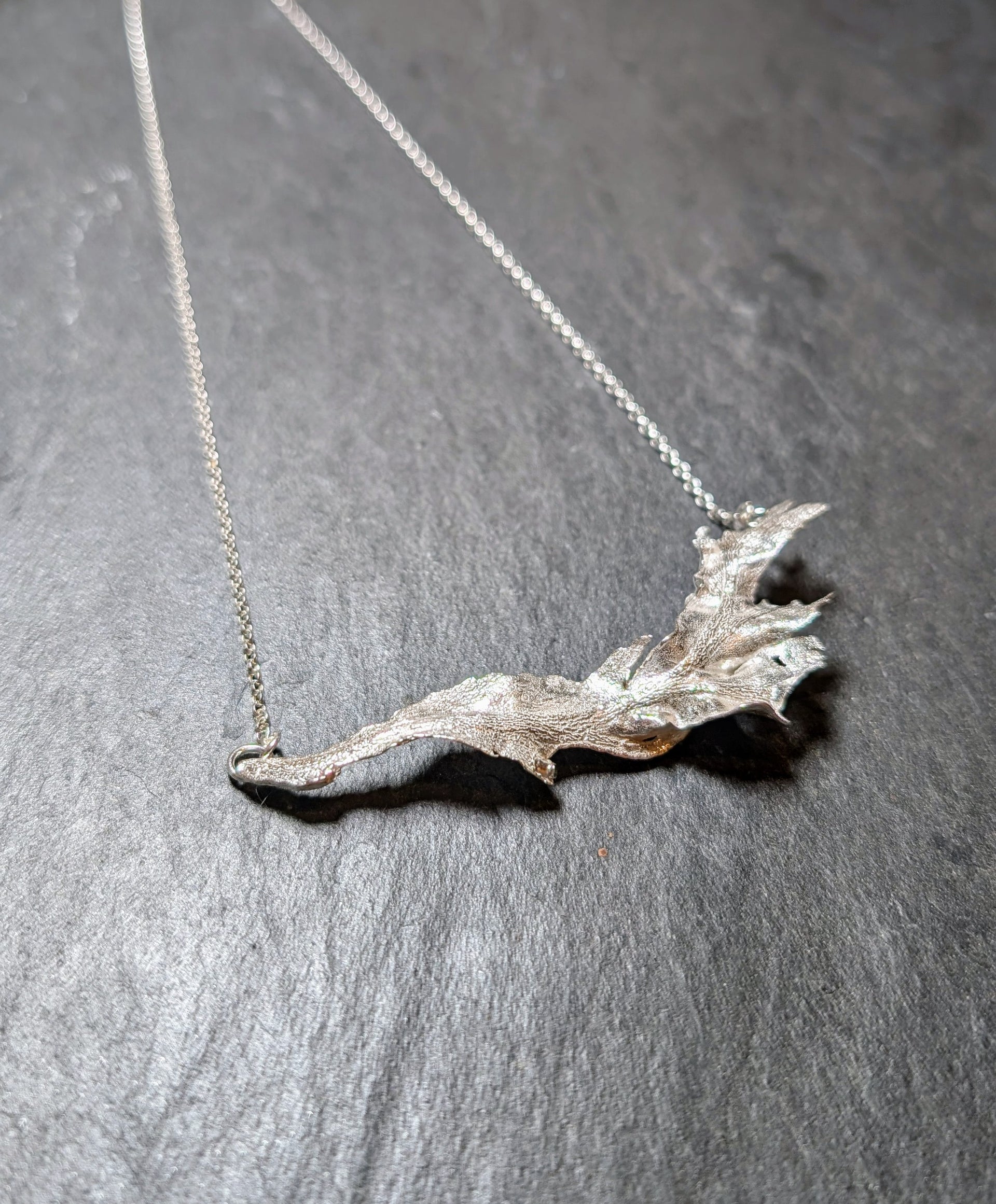 This statement necklace has been cast from dried seaweed after it has been built up with wax to add detail and this results in a unique item. This piece features a lovely piece of seaweed found at Wembury Point.