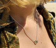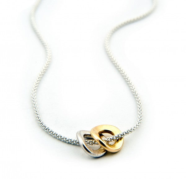This shiny pendant necklace, with two perfect curved loops, hand made in Sterling Silver and 18ct Gold, has a shiny hammered finish on one side and a soft satin finish on the other, snuggle together on a standard 1 18" length pop-corn chain. Perfect with any outfit.