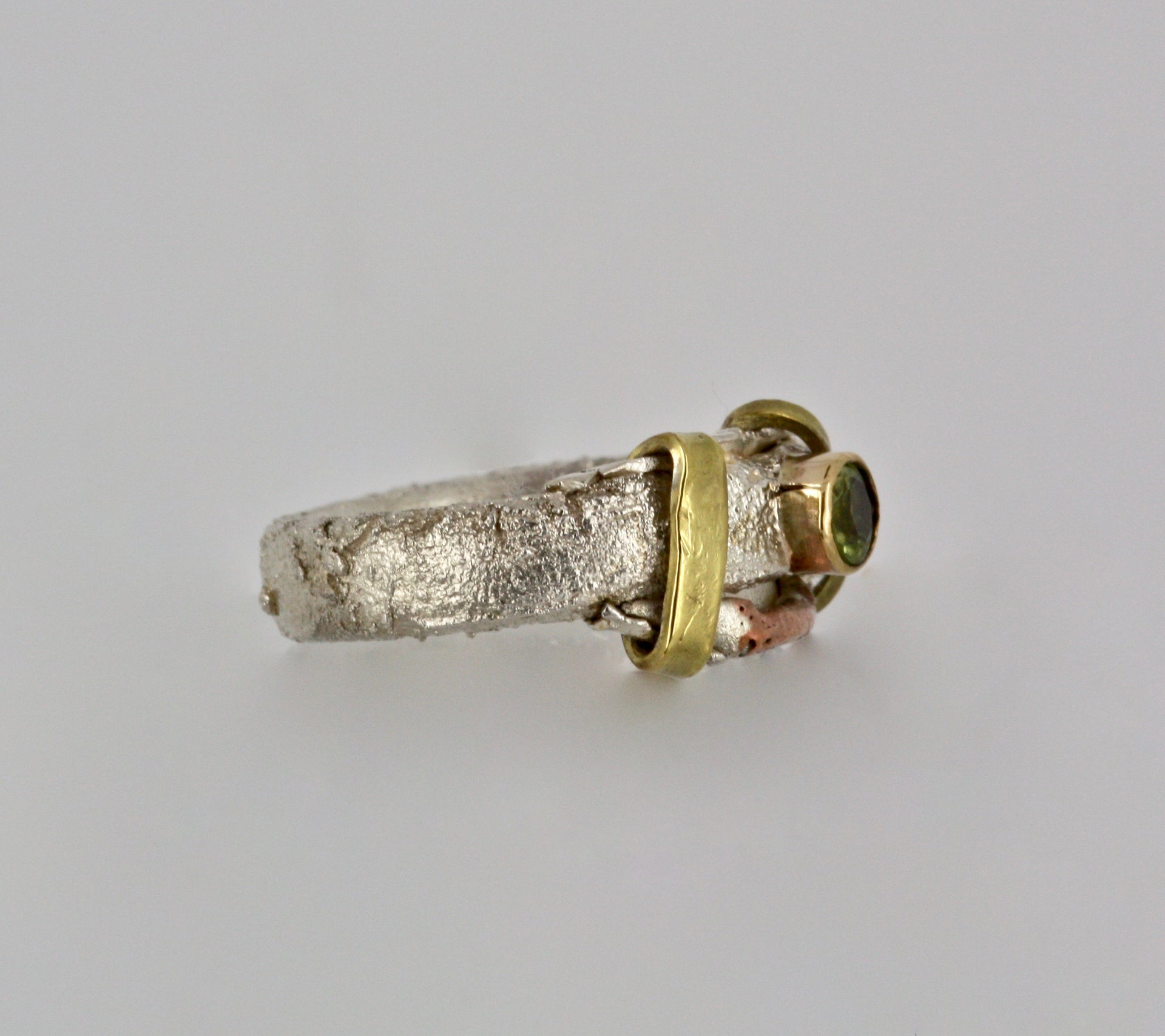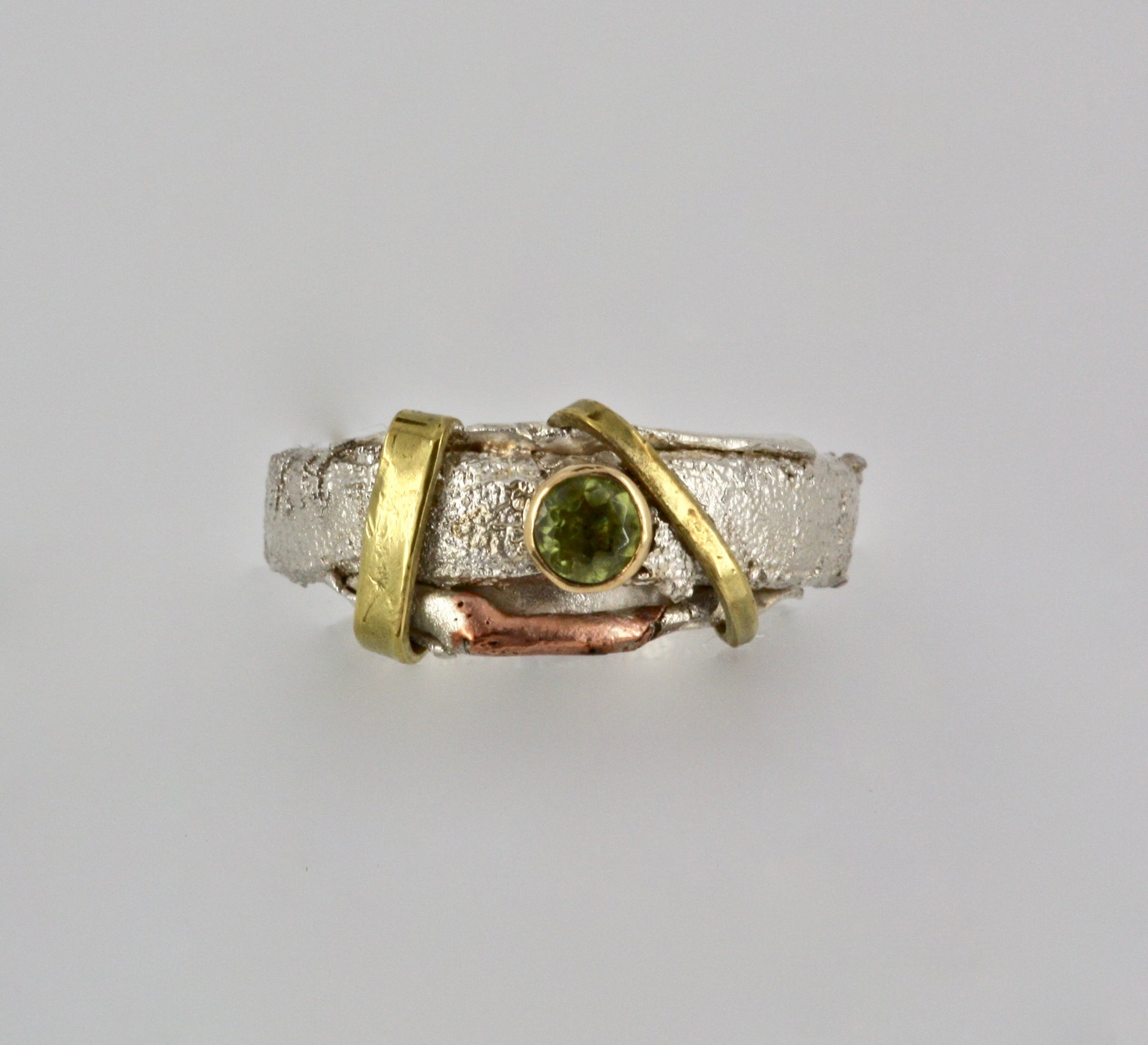 A beautiful ring made from silver, brass, copper, and gold that features a lovely tube set 5mm peridot.