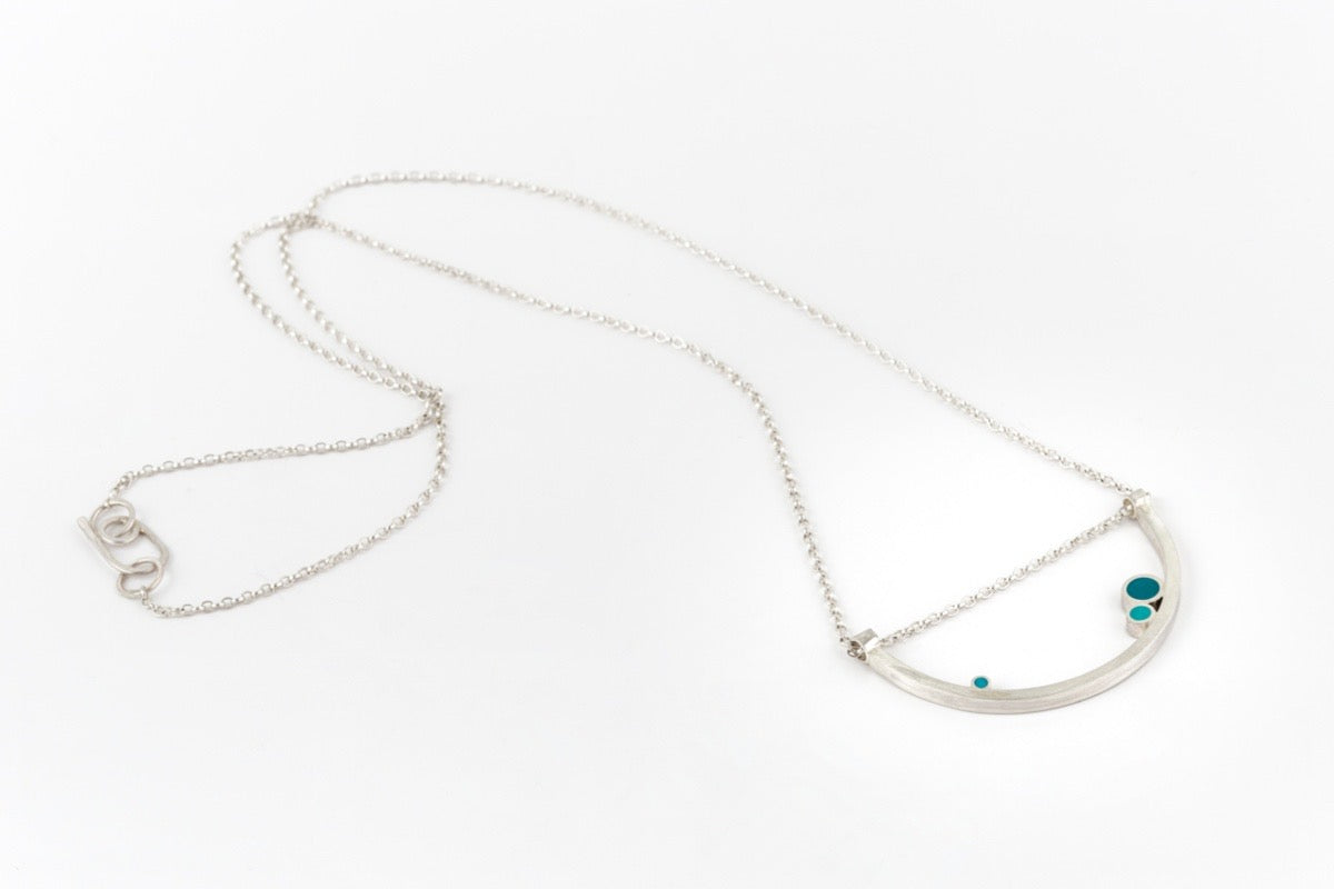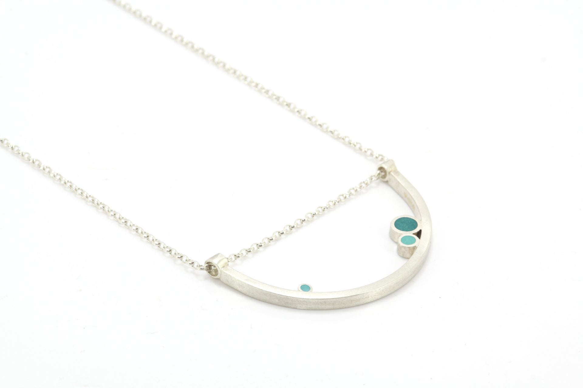 A contemporary silver and resin necklace that is bold and modern. The subtle resin colours in their silver circles add a small pop of interest.