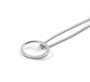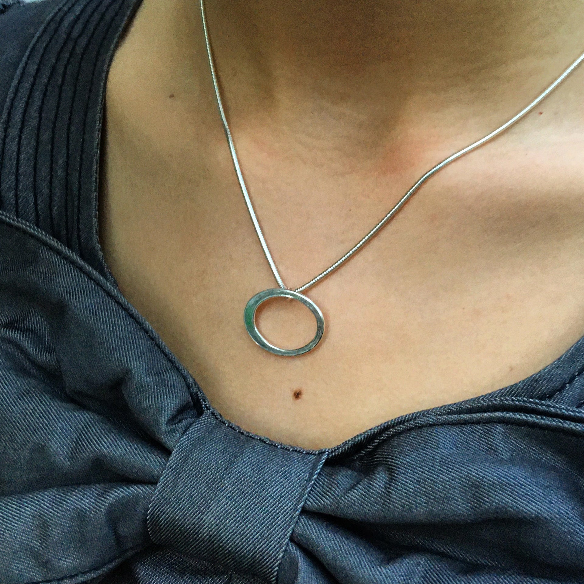 A contemporary designer necklace, minimalist, beaten silver Halo shape, softly textured for a satin finish, on a snake chain necklace, for someone with a discerning eye for Scandinavian or Modernist design.