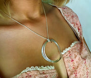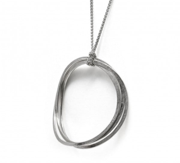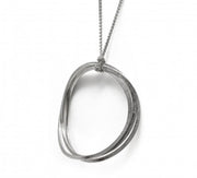 This contemporary looped pendant on a knotted chain is a beautifully simple designer piece in British Hall-marked silver. Contemporary and somehow timeless, it's round softly curved multi-forms make this triple-layered necklace a perfect example of the care and attention to detail in which we pride ourselves. Each of the three curved silver Honesty loops is individually hammered by hand.
