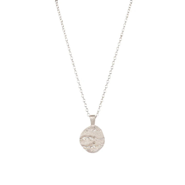 Handmade silver etched necklace with the words 'on and on' etched into the pendant. The pendants hangs from a silver chain.
