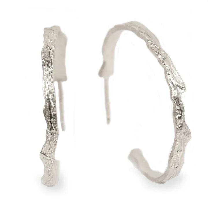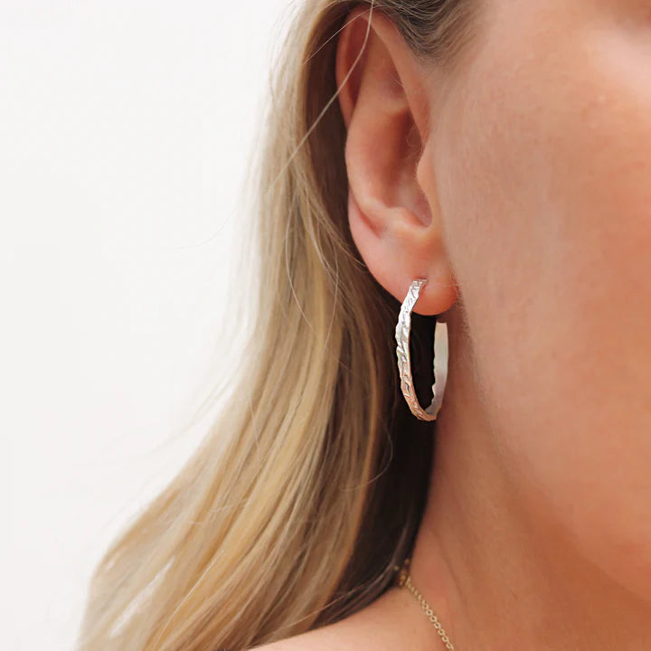 Large silver hoops with Diana's everlasting words etched in relief. One earring is etched with the words 'Future, Perpetuum, Infinite' the other 'Infinity, Perpetual, Forever'.