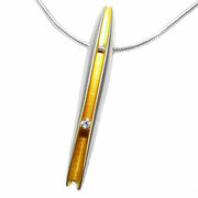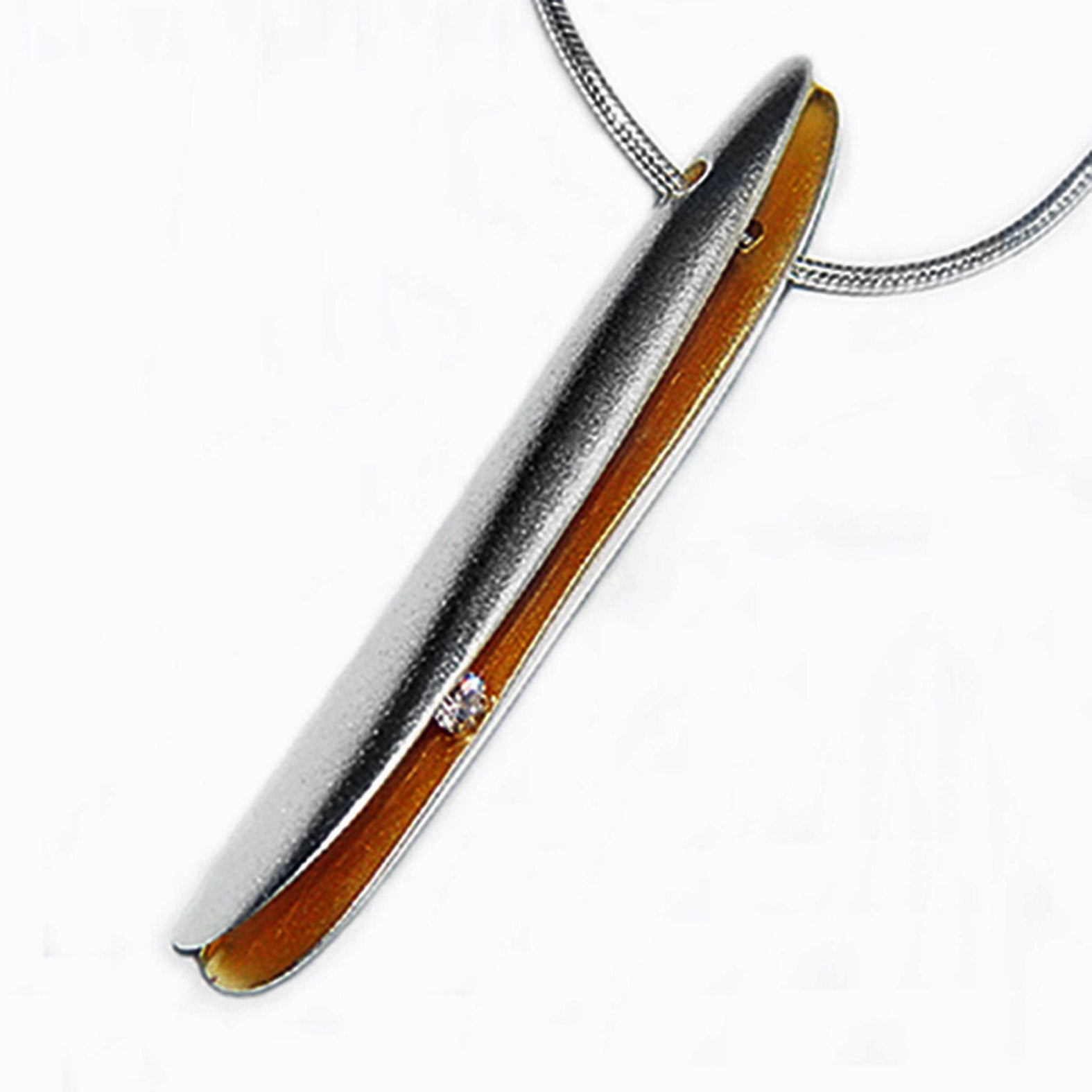 Silver shell diamond pendant with 3pt diamond set within a rich 22ct gold plated interior. An eye catching and unusual necklace in sterling silver. The diamond is tension set which allows maximum light around the stone. This simple elegant pendant is perfect for all occasions and would make a wonderful gift.