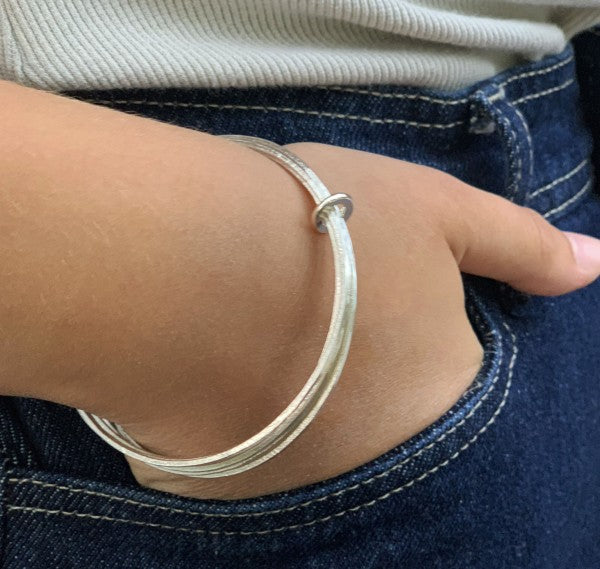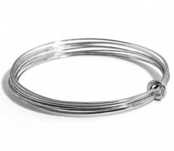This hand-made modern designer bangle in hammered silver gives the illusion of being eight separate bangles while being made from a continuous coiled length of beaten silver, giving the effect of many fine bangles bound by a silver ring. Evoking rain falling on water, this hand-forged bangle is textured with a shiny hammered finish on one side and a soft satin finish on the other.