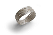 Hammered and textured silver wire is wrapped and woven before being set with nine 18ct gold centered acorn cups, this bangle is a real statement piece.
